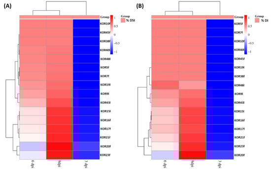 Heatmap visualization and hierarchical clustering of 16 Colletotrichum strains based on their virulence on detached olive fruits of Koroneiki cultivar. Clustering analysis was performed based on (A) disease severity index (DSI%) and (B) disease incidence (DI%) at 3, 6, and 9 dpi as the dependent variable to assess similarity patterns among different fungal isolates. Clustering analysis distinguished two distinct clusters, grouping the isolates into high- and low-infection ability.