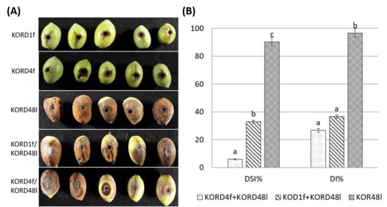 Efficacy of endophytes KORD1f and KORD4f in the reduction in anthracnose symptoms in olive fruits inoculated with Colletotrichum acutatum KOR48l. (A) Representative photos of anthracnose lesions on wounded olive drupes pre-treated with KORD1f and KORD4f prior to C. acutatum KOR48l infection. Olive drupes inoculated only with KORD1f and KORD4f were used as negative controls and inoculated with KORD48l as a positive control. (B) Disease incidence (DI%) and disease severity index (DSI%) of anthracnose symptons were calculated as the percentage of infected fruit in three independent experiments, each consisting of 10 olive drupes. Data represent mean (SD) values and letters indicate statistically significant differences after Tukey analysis.