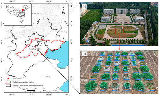 Overview of the study area. Note: (a) illustrates the geographical location, (b) shows an aerial view of the field station, and (c) details the layout of the simulated experimental plots.