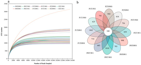 Sequencing results demonstrated adequate depth, as shown by the saturation of bacterial community dilution curves (Figure 2a) and a Goods coverage estimate of 0.99, confirming that the sequencing reliably captured the soil microbial community structure. To decipher the similarities and differences in microbial community composition across treatments, a Venn diagram was constructed based on observed species (Figure 2b). A total of 15,704 bacterial OTUs were detected. Strikingly, only 348 OTUs (2.21% of the total) were shared across all treatments. The P1T0W1 treatment (medium plant diversity, no warming, increased precipitation) harbored the highest number of unique OTUs (1462, accounting for 9.31% of the total), whereas the P0T1W1 treatment (single plant species, warming, increased precipitation) contained the fewest (683 OTUs, 4.35% of the total). Together, this delineates a limited core microbiome shared across all conditions and identifies a treatment-specific assemblage. This pattern indicates that intermediate plant diversity, combined with ample moisture but without warming, created the most distinct ecological niche space, supporting a more unique set of bacterial taxa compared to species-poor or stressed systems.