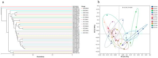 Beta diversity analysis further elucidated the structural differences in bacterial communities among treatments. Clustering analysis (Figure 3a) showed that replicate samples from the same treatment (e.g., P0T0W0, P2T1W1) first clustered into minor branches at low dissimilarity levels (<0.1). These subsequently aggregated into larger branches corresponding to plant diversity levels (P0 → P1 → P2), forming a clear gradient from single-species to medium-diversity and high-diversity communities at dissimilarity thresholds between 0.1 and 0.3. In contrast, the effects of climate factors were not distinctly evident. Principal coordinate analysis (PCoA, Figure 3b) further confirmed clear separation in bacterial community structure among the different treatments. These results demonstrate that plant diversity is the dominant factor regulating community structure differentiation. The low-diversity systems (P0), likely due to missing functional groups, compressed ecological niches, and limited resource-use strategies, exhibited microbial community structures that significantly diverged from medium- and high-diversity systems.
