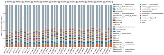 At the genus level, the dominant bacterial taxa varied considerably among treatments (Figure 5). Nocardioides and Lysobacter were ubiquitously present as core genera, with relative abundances exceeding 1% in multiple treatments. In low-diversity plots (P0, single species), Nocardioides and Lysobacter dominated, with Nocardioides reaching 2.00% in both P0T0W0 and P0T1W1 treatments. A distinct community shift occurred under medium plant diversity (P1, three species), where Sphingomonas emerged as the predominant genus. Its abundance peaked at 5.61% in the P1T0W1 treatment (medium diversity, increased precipitation). This suggests that the specific root exudate profile and microenvironment generated by this particular plant diversity level, especially under increased moisture, acted as a strong biotic filter, selectively enriching for metabolically versatile taxa like Sphingomonas. Microvirga and Novosphingobium also became consistently prominent members within this group. In high-diversity plots (P2, six species), the community was characterized by a core of Nocardioides and Lysobacter, but with notably elevated abundances of Ensifer, Novosphingobium, and Microvirga.