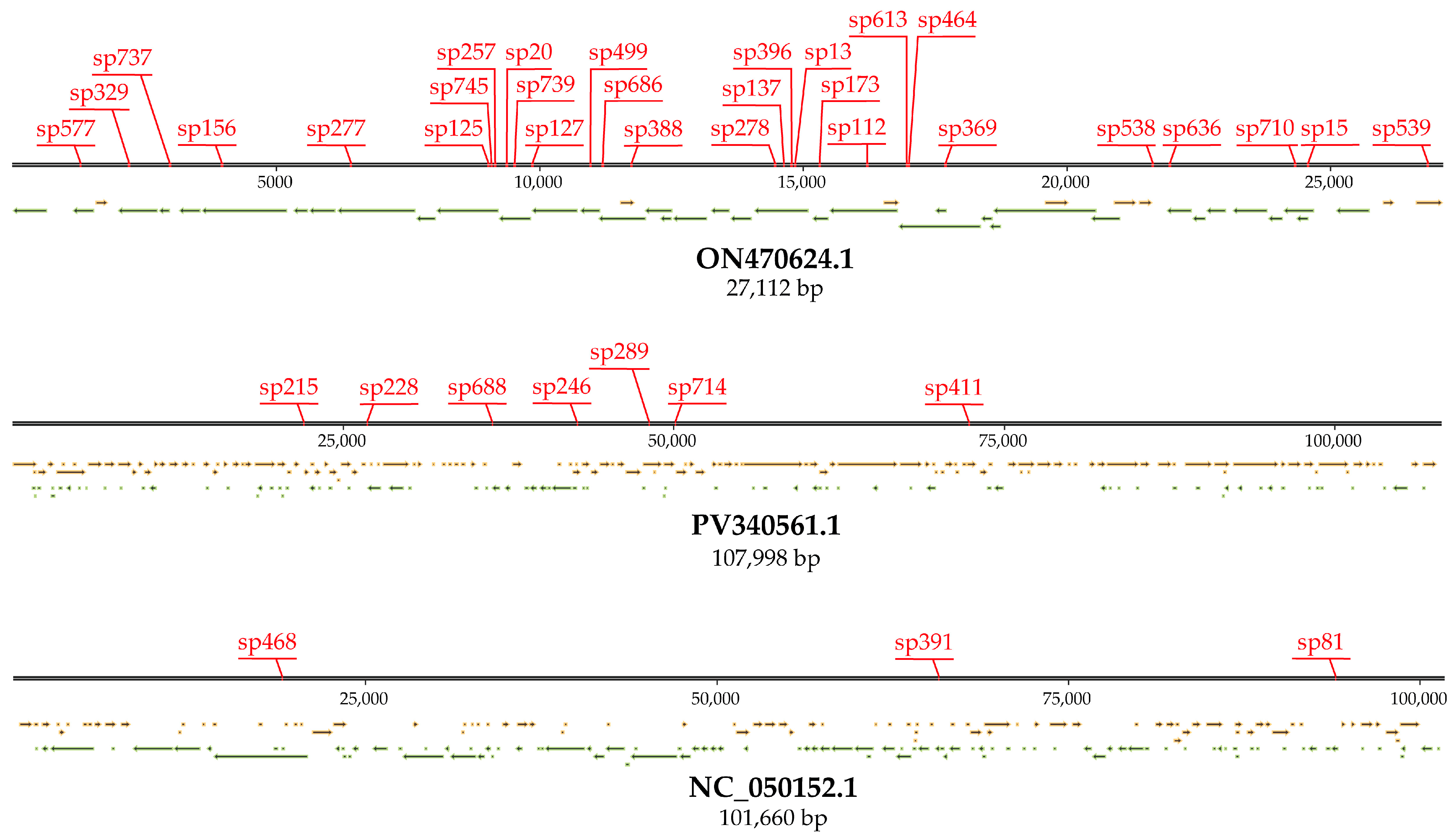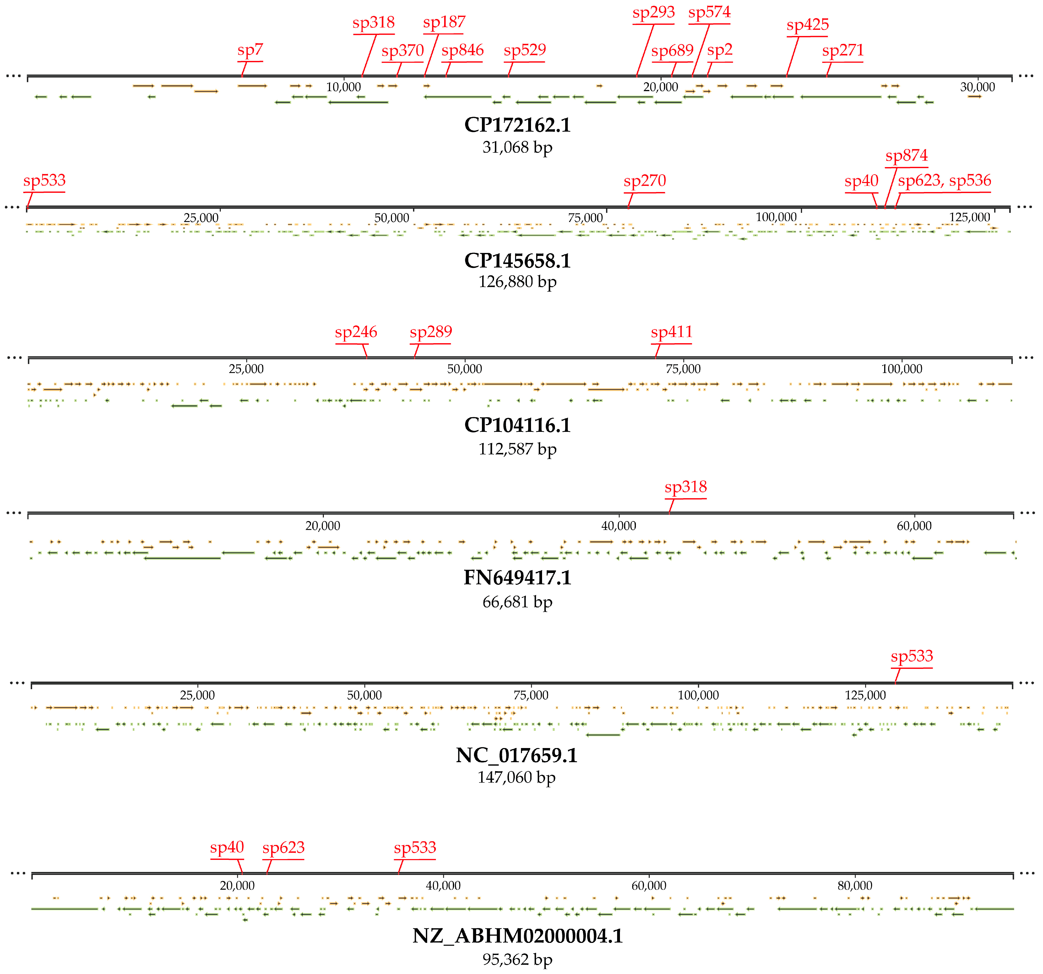 - Dion, M.B.; Shah, S.A.; Deng, L.; Thorsen, J.; Stokholm, J.; Krogfelt, K.A.; Schjørring, S.; Horvath, P.; Allard, A.; Nielsen, D.S.; et al. Escherichia coli CRISPR arrays from early life fecal samples preferentially target prophages. ISME J. 2024, 18, wrae005. [Google Scholar] [CrossRef]