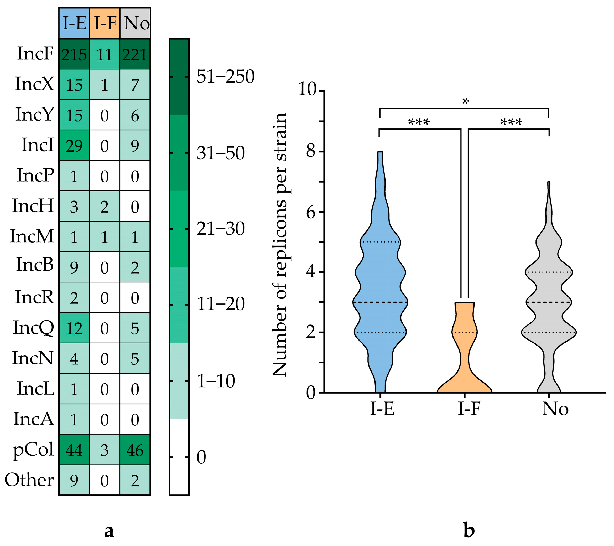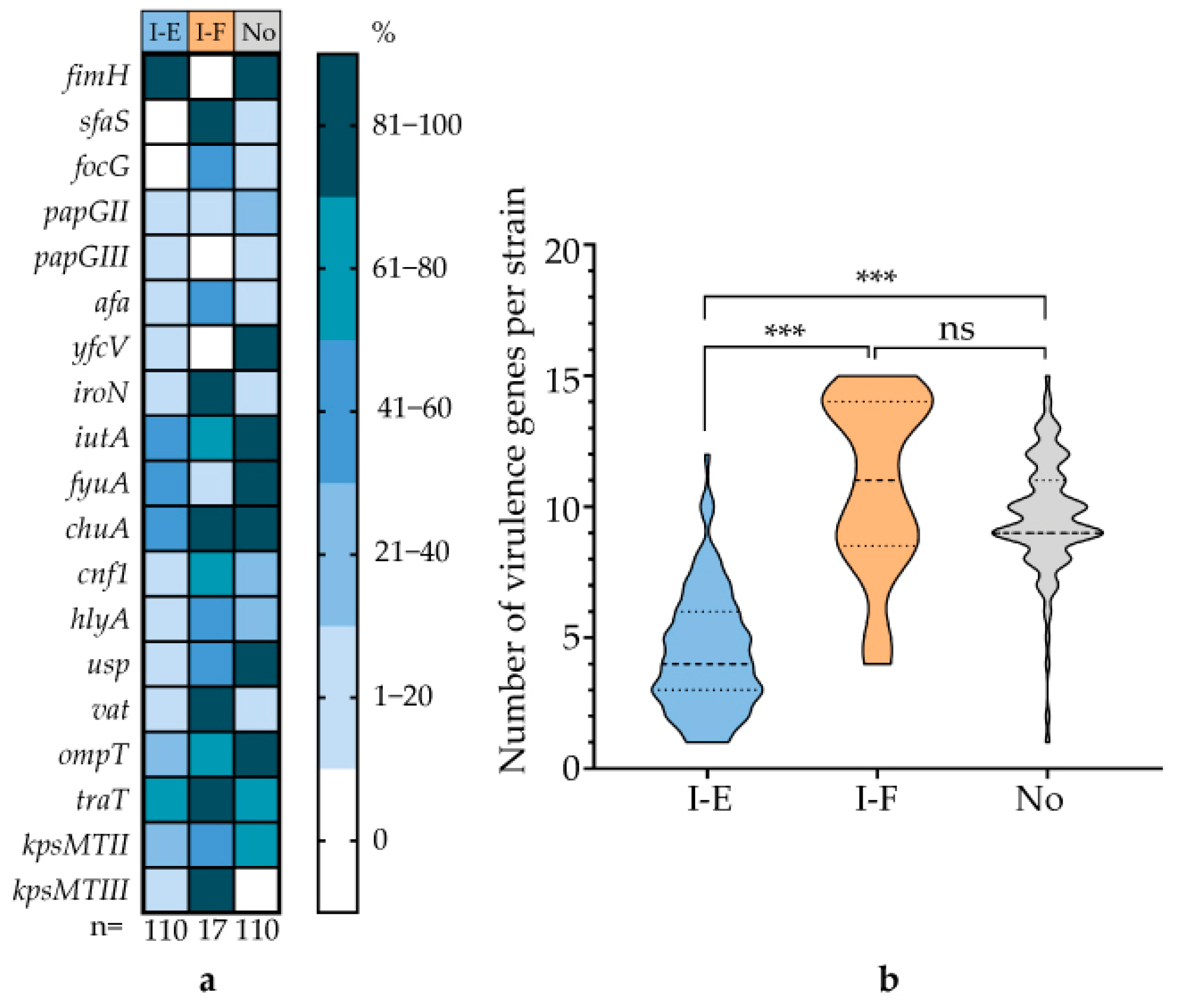 3.5. E. coli Phylogenetic Groups and CRISPR-Cas System Prevalence