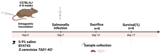 - Each of the three treatment groups was split into two sub-cohorts (n = 6). Sub-cohort 1 (5-day infection study): Mice were challenged orally with 1 × 107 CFU mL−1 of S. typhi and weighed daily. On day 5, the animals were euthanised; the ileum, colon, and caecum were aseptically removed. Intestinal tissue segments were weighed and homogenized in 1 mL of 0.1% Triton X-100. Serial dilutions were plated on an LB plate supplemented with 200 µg mL−1 of streptomycin to enumerate S. typhi, and on YPD plates supplemented with 200 µg mL−1 of chloramphenicol to quantify S. cerevisiae TAD1-KO colonization. Sub-cohort 2 (survival study): After an identical challenge, mice were monitored for 10 days, and survival was recorded.