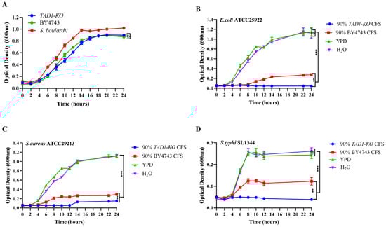 Growth curve measurement. (A) Loss of TAD1 does not impair S. cerevisiae growth. Growth curves of parental strain BY4743, S. boulardii, and S. cerevisiae TAD1-KO cultivated in YPD at 30 °C, 200 rpm for 24 h. The superimposable curves indicate that TAD1 deletion is growth-neutral under standard laboratory conditions. (B–D) S. cerevisiae TAD1-KO elicits potent metabolite-mediated growth suppression. Growth curves of E. coli, S. aureus, and S. typhi exposed to 90% (v/v) S. cerevisiae TAD1-KO, BY4743, or nutrient controls at 37 °C, 200 rpm. S. cerevisiae TAD1-KO CFS significantly delayed lag-to-log transition, reduced µmax, and lowered stationary-phase density. Equivalent growth in sterile water and YPD controls excludes nutrient limitation, confirming inhibition by secreted bioactive metabolites. Data are means ± SD (n = 3); ** p < 0.01; *** p < 0.001; ns denotes no statistically significant difference.