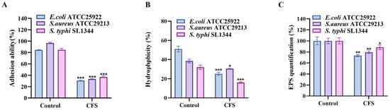 It has been reported that components of EPS, such as polysaccharides and proteins, may affect adhesion by altering surface charge and hydrophobicity [25]. Bacteria with high features adhere more easily, and high EPS production may enhance this feature, thus promoting adhesion [26]. There are complex interactions among them, which affect the biofilm formation, environmental adaptability, and ecological function of bacteria [27,28]. Therefore, we investigated the adhesion, hydrophobicity, and EPS production of E. coli, S. aureus, and S. typhi after S. cerevisiae CFS treatment. Compared with untreated controls, 50% (v/v) CFS reduced adhesion to glass by 53.8% (E. coli), 63.1% (S. aureus), and 47.9% (S. typhi) (Figure 5A; p < 0.05). Parallel measurements of cell-surface hydrophobicity (Figure 5B) and EPS yield (Figure 5C) showed concordant decreases: hydrophobicity dropped by 22.9%, 9.4%, and 16.0%, while EPS production fell by 26.6%, 20.6%, and 11.7%, respectively (all p < 0.05). Thus, S. cerevisiae TAD1-KO CFS simultaneously suppresses adhesion, surface hydrophobicity, and EPS biosynthesis—three key prerequisites for robust biofilm development.