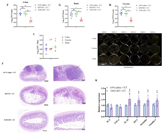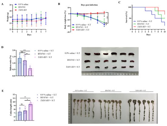 - The enteritis model of mice infected by S. typhi SL1344 was established. Specific-pathogen-free grade male C57BL/6J mice, each at 6–8 weeks of age, weighing 16–20 g, were purchased from Jiangsu Jicui Pharmachem Biotechnology Co. (Nanjing, China), Laboratory Animal Production License No. SCXK (Su) 2018-0008; Laboratory Animal Use License No. SYXK (Su) 2020-0048 (barrier environment). All animal experimental protocols were approved by the Animal Ethics Committee of Xuzhou Medical University.