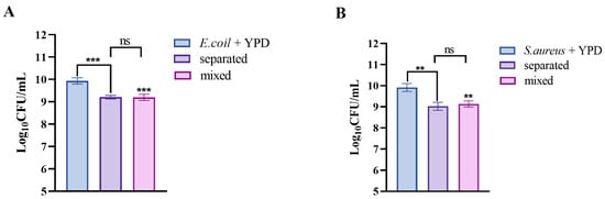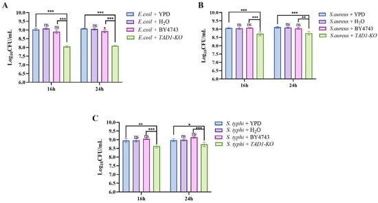 In order to investigate whether there is an inhibitory effect of live S. cerevisiae TAD1-KO and BY4743 on the growth of E. coli, S. aureus, and S. typhi, a cell–cell co-culture model was established. Overnight cultures of S. cerevisiae and pathogens were washed twice with PBS and resuspended to 1 × 107 CFU mL−1 in YPD or LB, respectively. For co-culture, 1 mL of each yeast suspension was mixed 1:1 (v/v) with 1 mL of pathogen; pathogen mono-cultures received 1 mL of YPD, and blank controls received 1 mL of sterile water. All tubes were incubated at 37 °C, 200 rpm. After 16 h and 24 h, aliquots were spiral-plated on LB agar containing 10 mg mL−1 of amphotericin B to enumerate viable bacteria. Experiments were performed in three independent biological replicates.