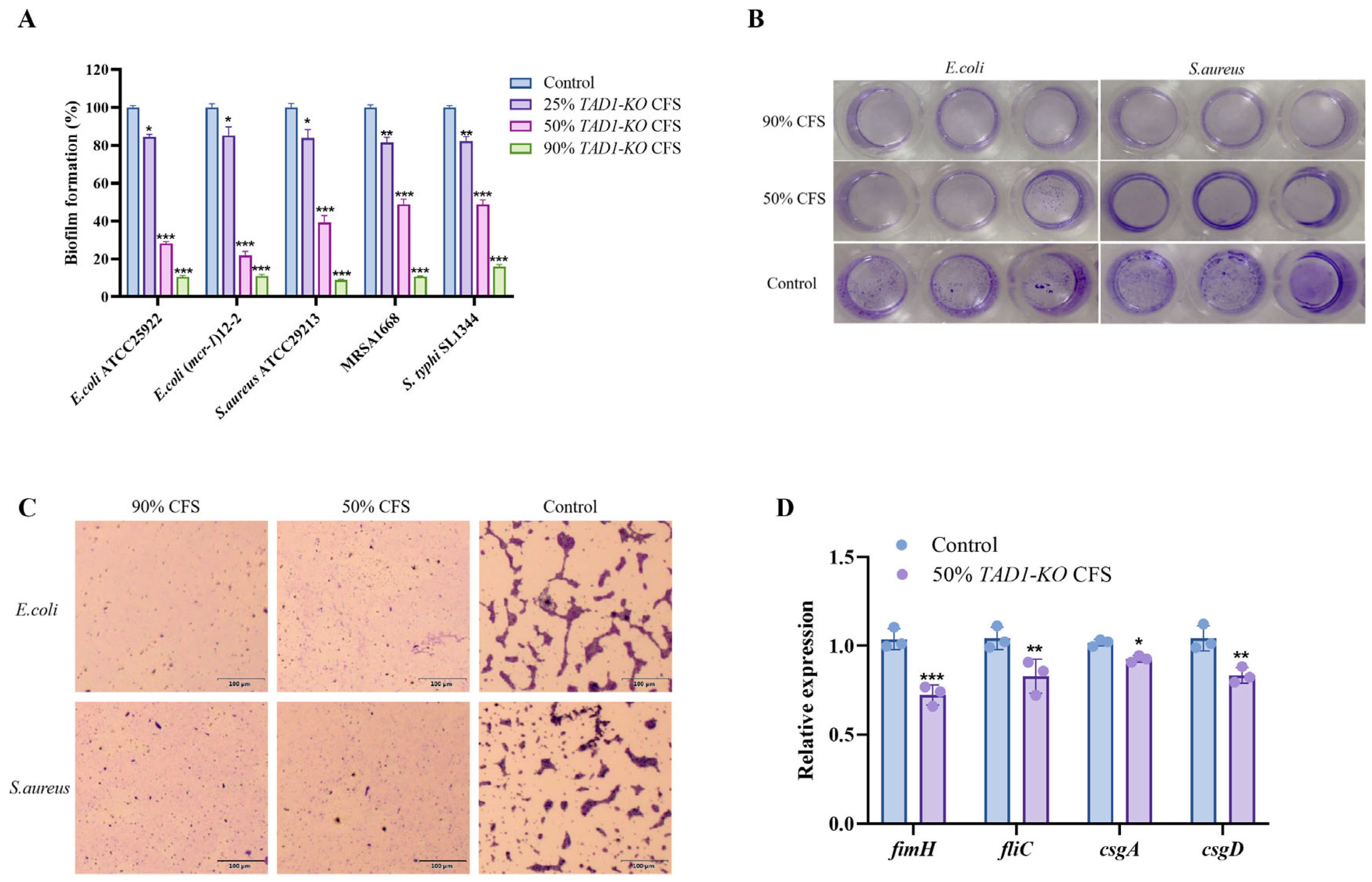 3.4. S. cerevisiae TAD1-KO CFS Inhibits Biofilm Formation of Pathogenic Bacteria