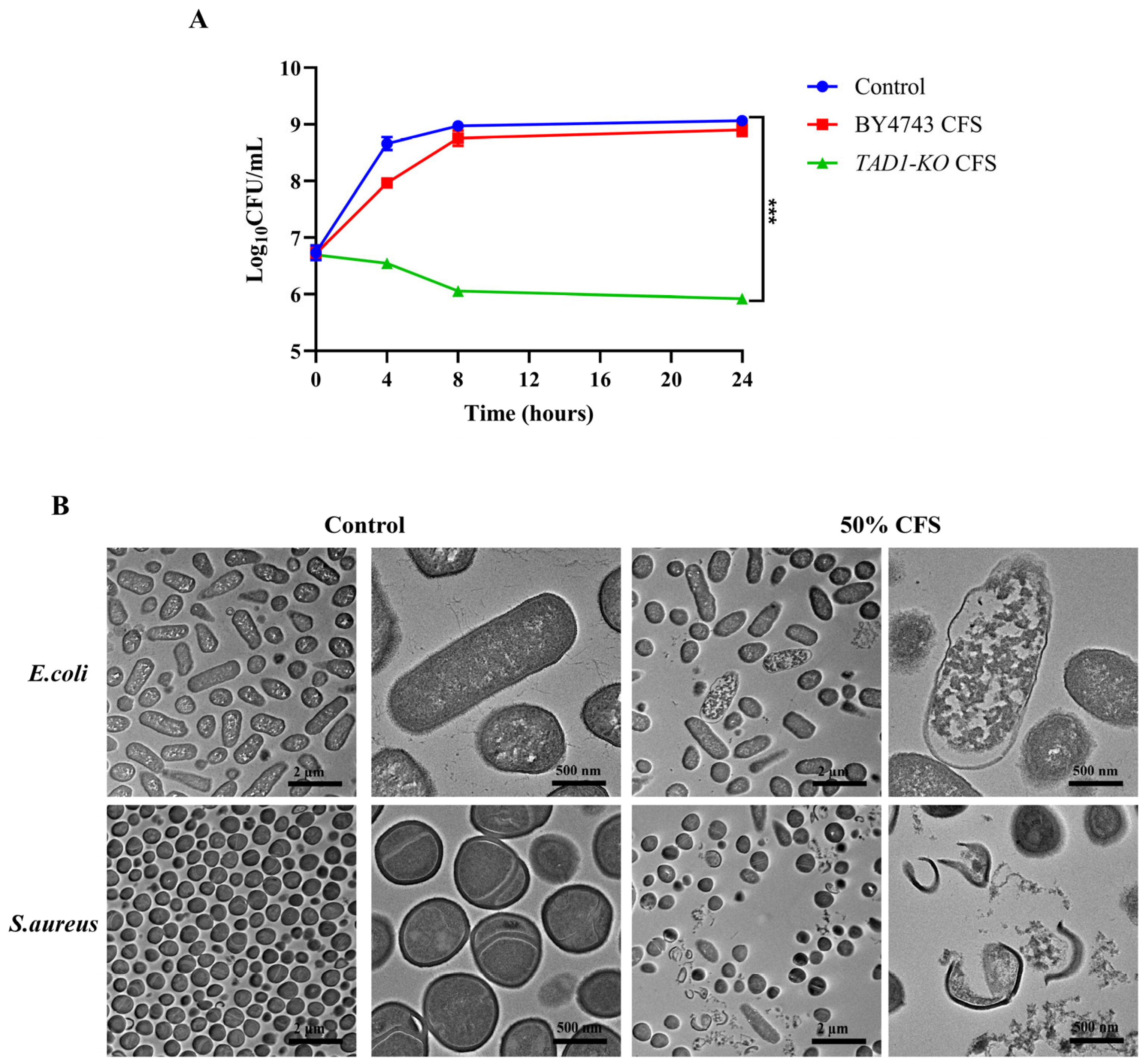 3.2. S. cerevisiae TAD1-KO CFS Inhibits Proliferation of E. coli, S. aureus, and S. typhi