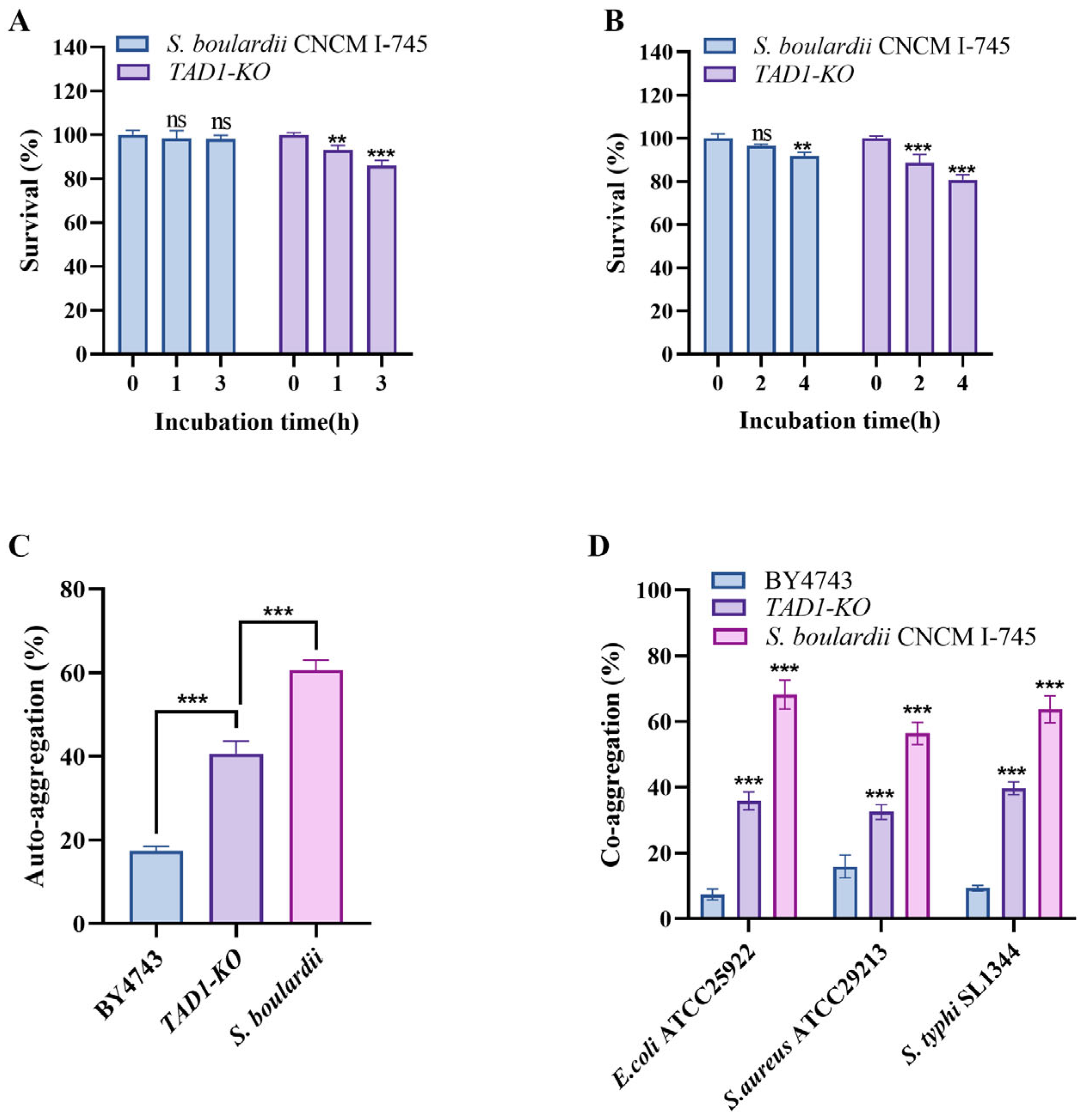 - Auto-aggregation Ability Assay: Auto-aggregation of S. cerevisiae TAD1-KO and its co-aggregation with E. coli, S. aureus, and S. typhi were assessed in parallel, with BY4743 and S. boulardii serving as the reference and positive control, respectively. Yeast strains grown overnight were harvested, washed twice with PBS, and resuspended in the same buffer to an OD600 of ≈0.5 (A0). Suspensions were left undisturbed at room temperature; after 5 h; the OD600 of the upper phase was recorded (Aₜ). Auto-aggregation (%) was calculated using the following equation: