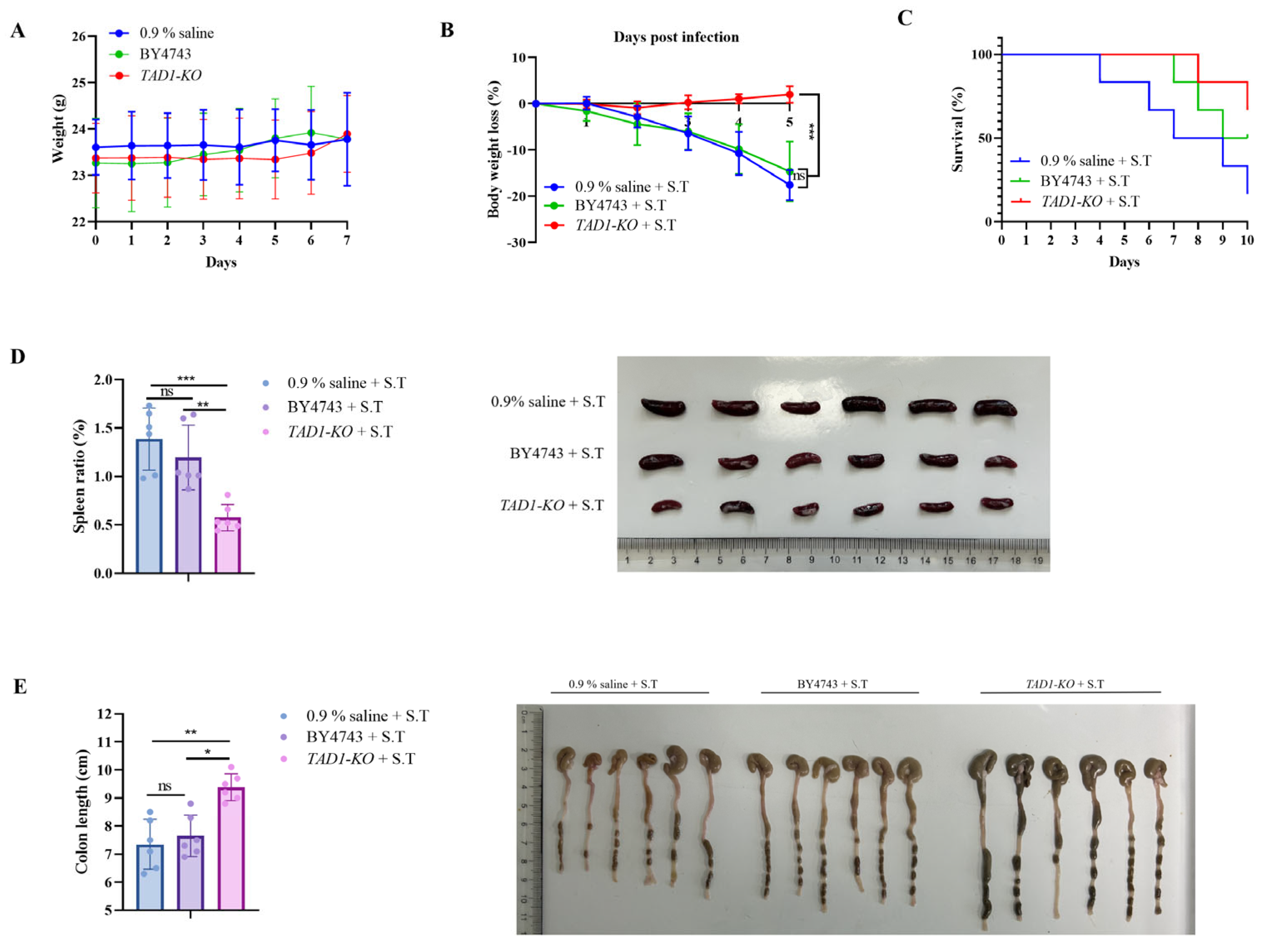 - SPF male C57BL/6J mice were acclimated for one week prior to experimentation. S. cerevisiae TAD1-KO and BY4743 were harvested, washed twice with PBS, and resuspended at 5.0 × 108 CFU mL−1. Thirty-six mice were randomly allocated into three groups (n = 12 each) and gavaged once daily for 7 days with 0.1 mL of: S. cerevisiae TAD1-KO suspension, BY4743 suspension, 0.9% saline (control). Animals were identified by tail markings; their general appearance and body weight were recorded daily. Safety endpoints were evaluated by comparing the two yeast groups with the saline control. The specific procedure showed in Figure 1.