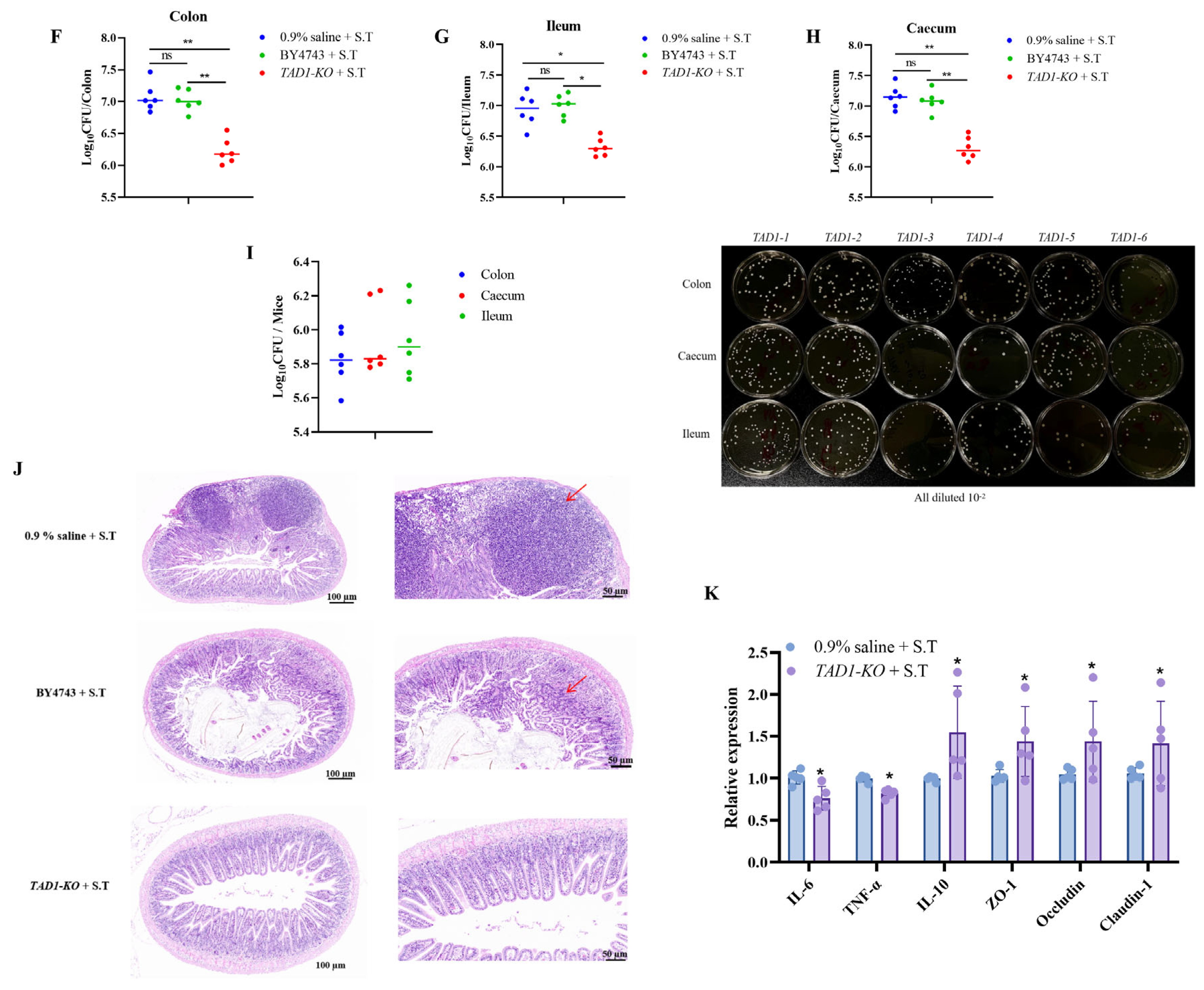 3.10.2. S. cerevisiae TAD1-KO Has Therapeutic and Protective Effects on Enteritis in Mice Caused by S. typhi