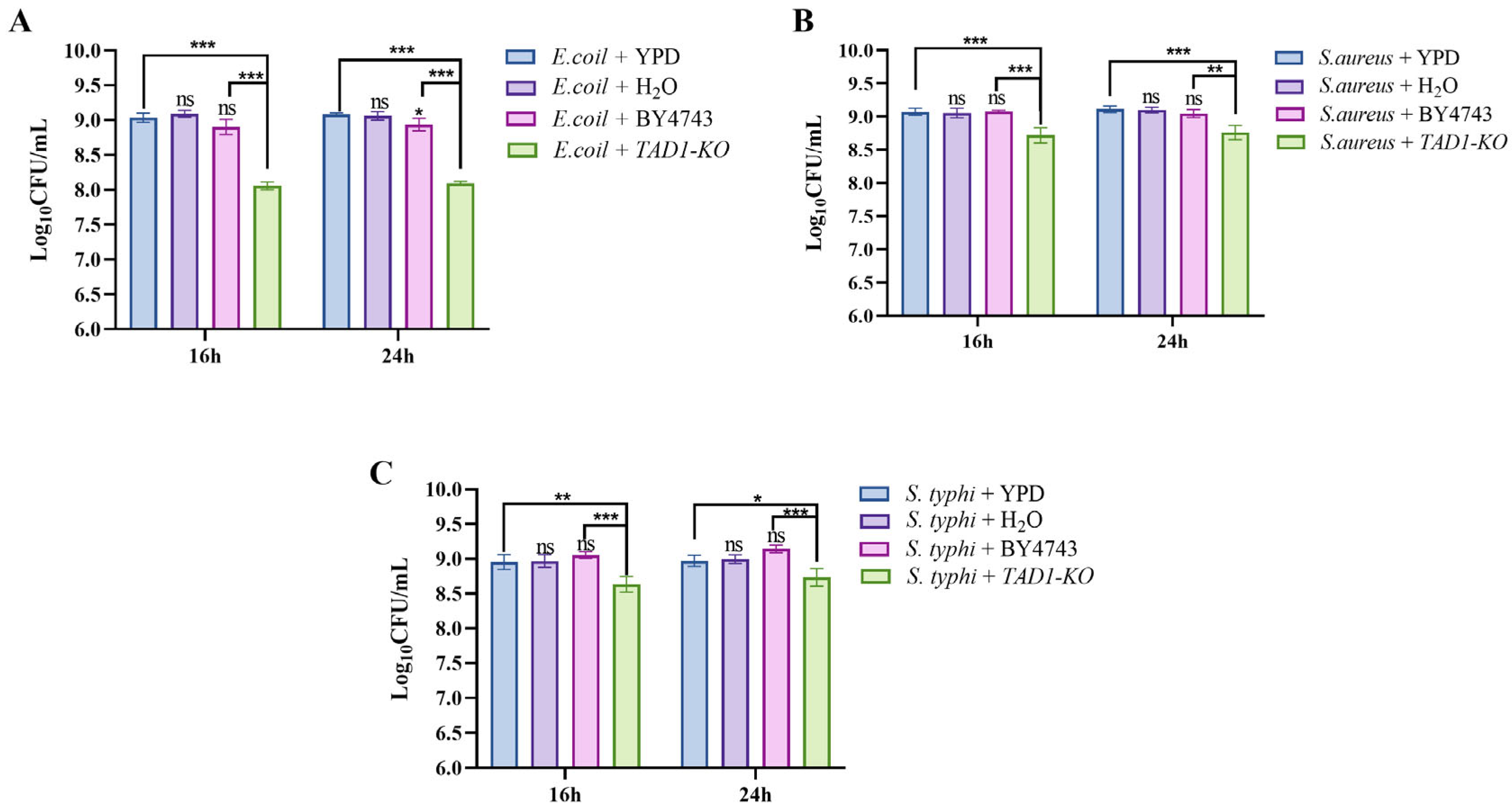 3.11. S. cerevisiae TAD1-KO Inhibits the Proliferation of E. coli, S. aureus, and S. typhi