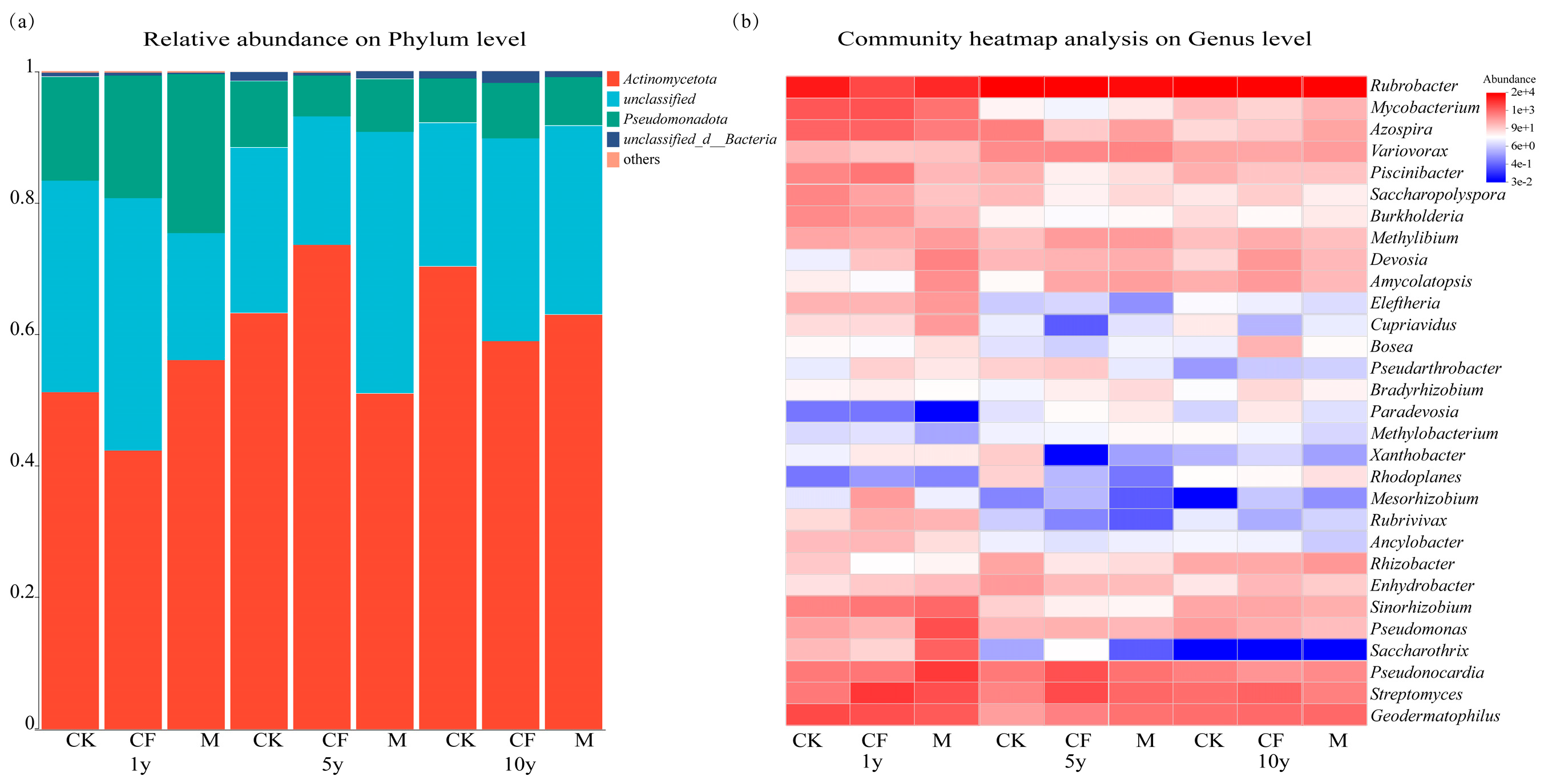 - Li, F.; Chen, L.; Zhang, J.; Yin, J.; Huang, S. Bacterial Community Structure after Long-term Organic and Inorganic Fertilization Reveals Important Associations between Soil Nutrients and Specific Taxa Involved in Nutrient Transformations. Front. Microbiol. 2017, 8, 187. [Google Scholar] [CrossRef]