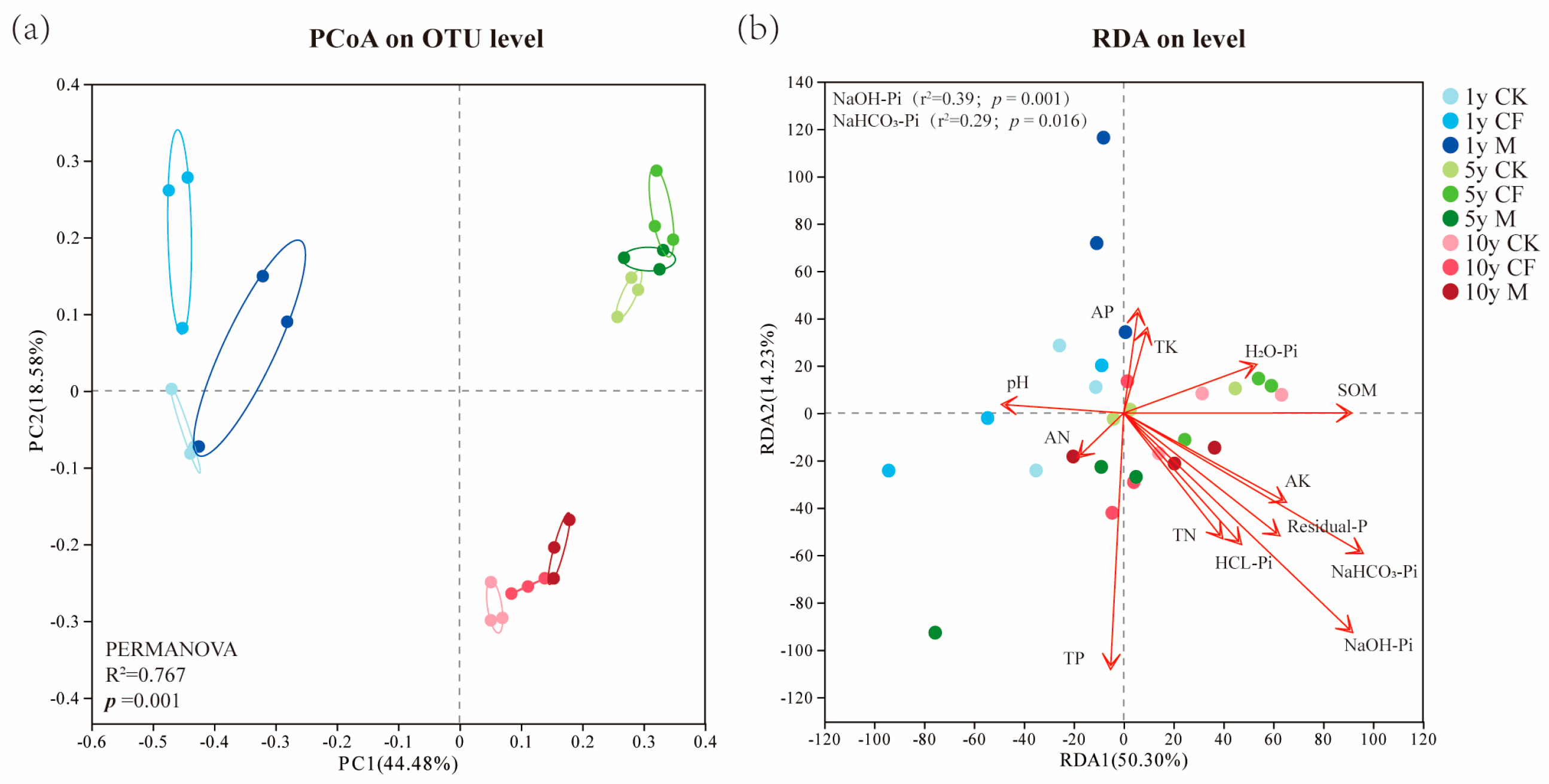 - Wang, L.; Wang, J.; Yuan, J.; Tang, Z.; Wang, J.; Zhang, Y. Long-Term Organic Fertilization Strengthens the Soil Phosphorus Cycle and Phosphorus Availability by Regulating the pqqC- and phoD-Harboring Bacterial Communities. Microb. Ecol. 2023, 86, 2716–2732. [Google Scholar] [CrossRef]