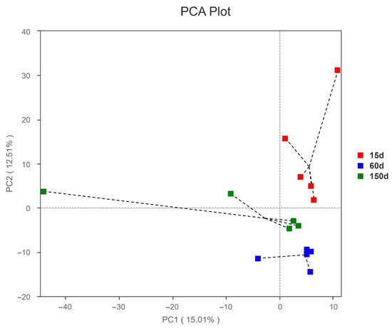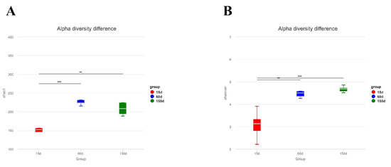 Alpha diversity analysis revealed significant differences in the fungal communities across the growth stages (Figure 4). The Chao1 index increased from 145.77 ± 40.30 at 15 days to 233.03 ± 24.70 at 60 days (p < 0.001), remaining at a high level of 223.41 ± 43.79 at 150 days (p < 0.01). Similarly, the Shannon index significantly increased from 3.08 ± 0.62 to 4.54 ± 0.29 at 60 days (p < 0.01) and further to 4.67 ± 0.13 at 150 days (p < 0.001). These results indicate significant age-dependent increases in both species richness and community evenness, with the most pronounced expansion occurring between 15 and 60 days of age.