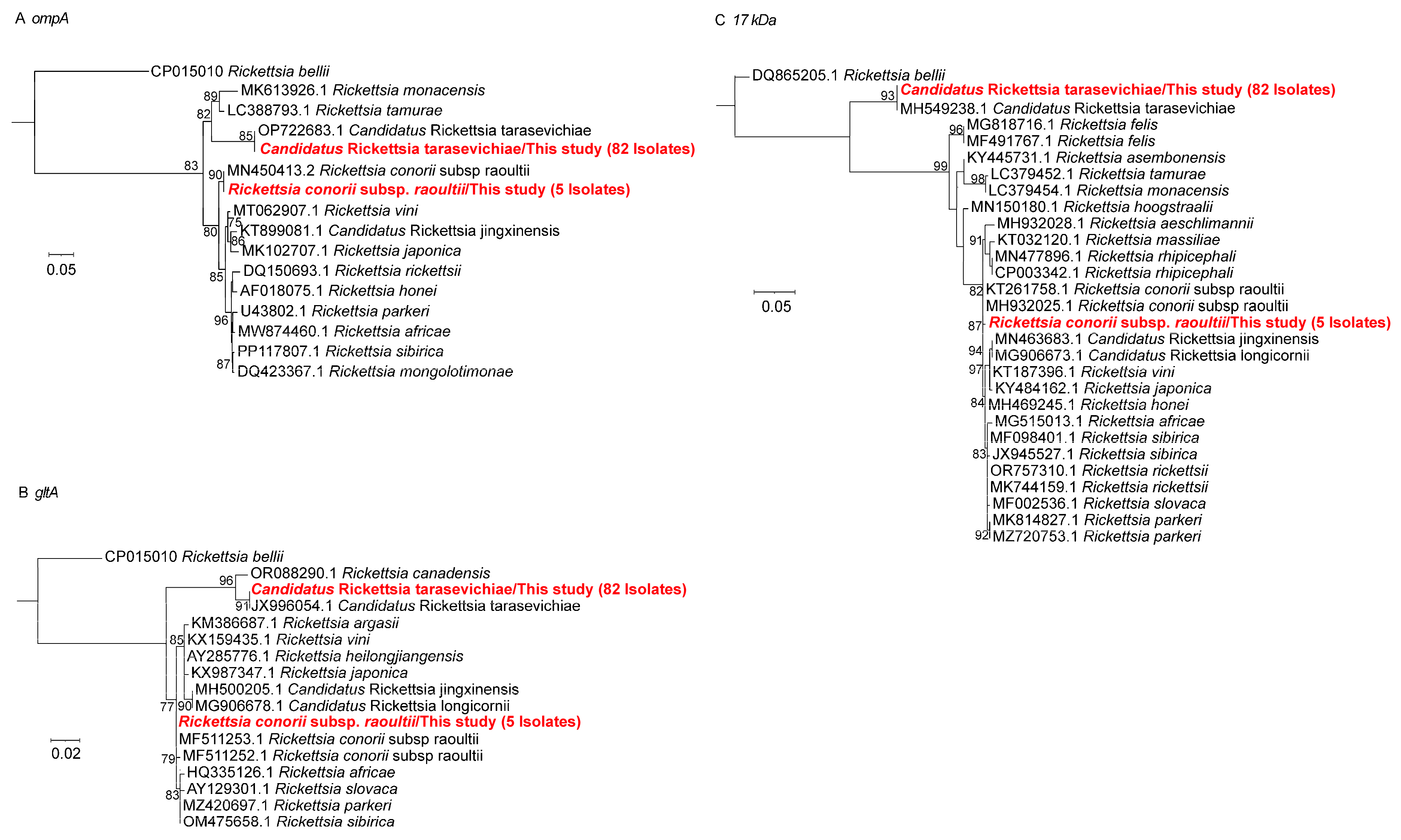 - Mediannikov, O.; Matsumoto, K.; Samoylenko, I.; Drancourt, M.; Roux, V.; Rydkina, E.; Davoust, B.; Tarasevich, I.; Brouqui, P.; Fournier, P.-E. Rickettsia Raoultii Sp. Nov., a Spotted Fever Group Rickettsia Associated with Dermacentor Ticks in Europe and Russia. Int. J. Syst. Evol. Microbiol. 2008, 58, 1635–1639. [Google Scholar] [CrossRef]