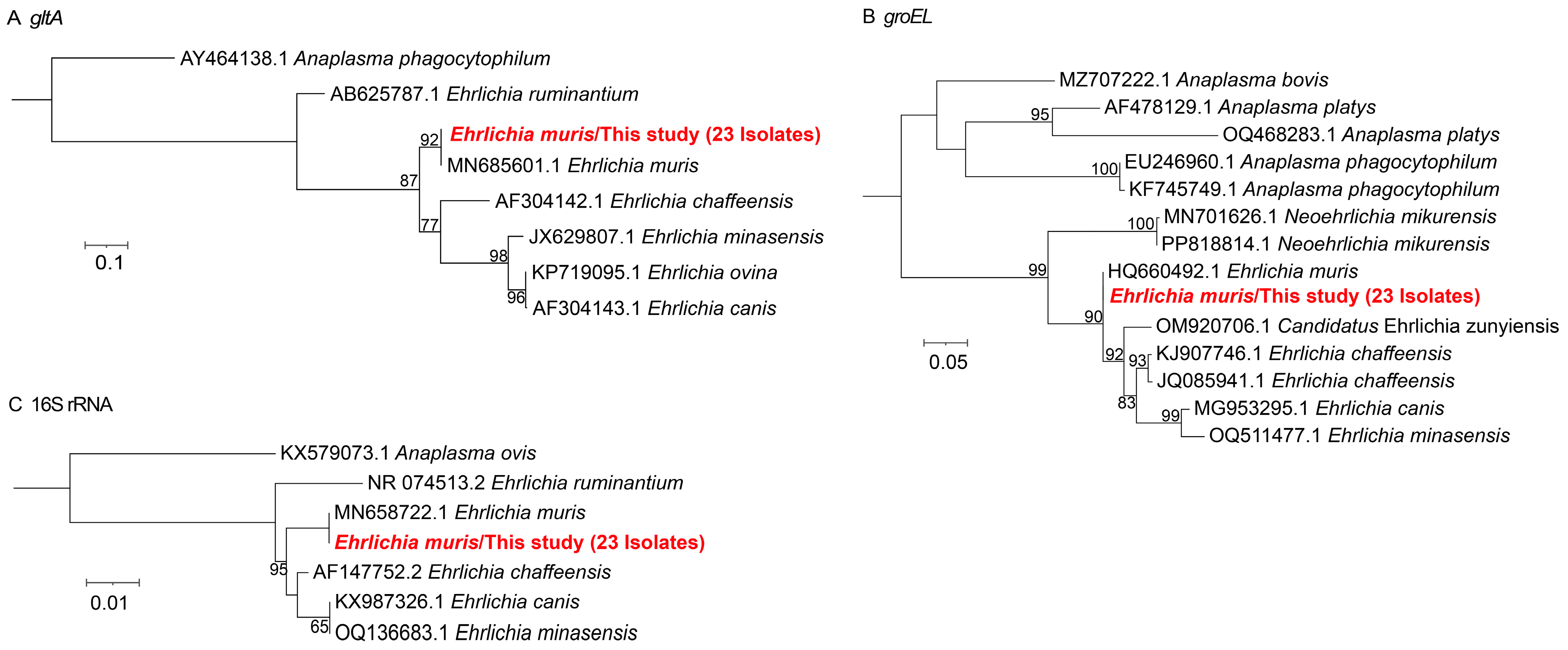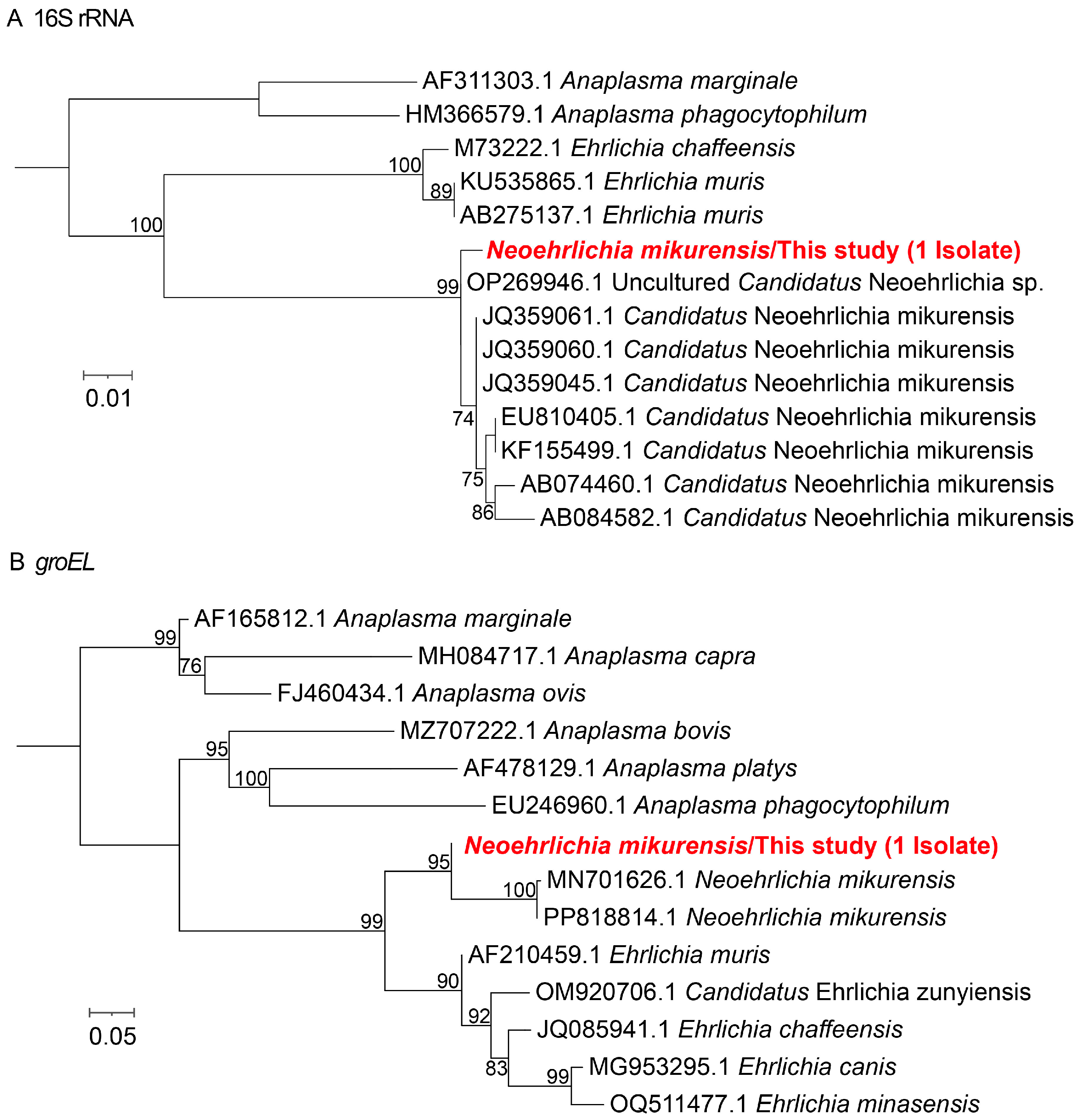 - Luo, L.; Sun, J.; Yan, J.; Wang, C.; Zhang, Z.; Zhao, L.; Han, H.; Tong, Z.; Liu, M.; Wu, Y.; et al. Detection of a novel Ehrlichia species in Haemaphysalis longicornis tick from China. Vector-Borne Zoonotic Dis. 2016, 16, 363–367. [Google Scholar] [CrossRef]