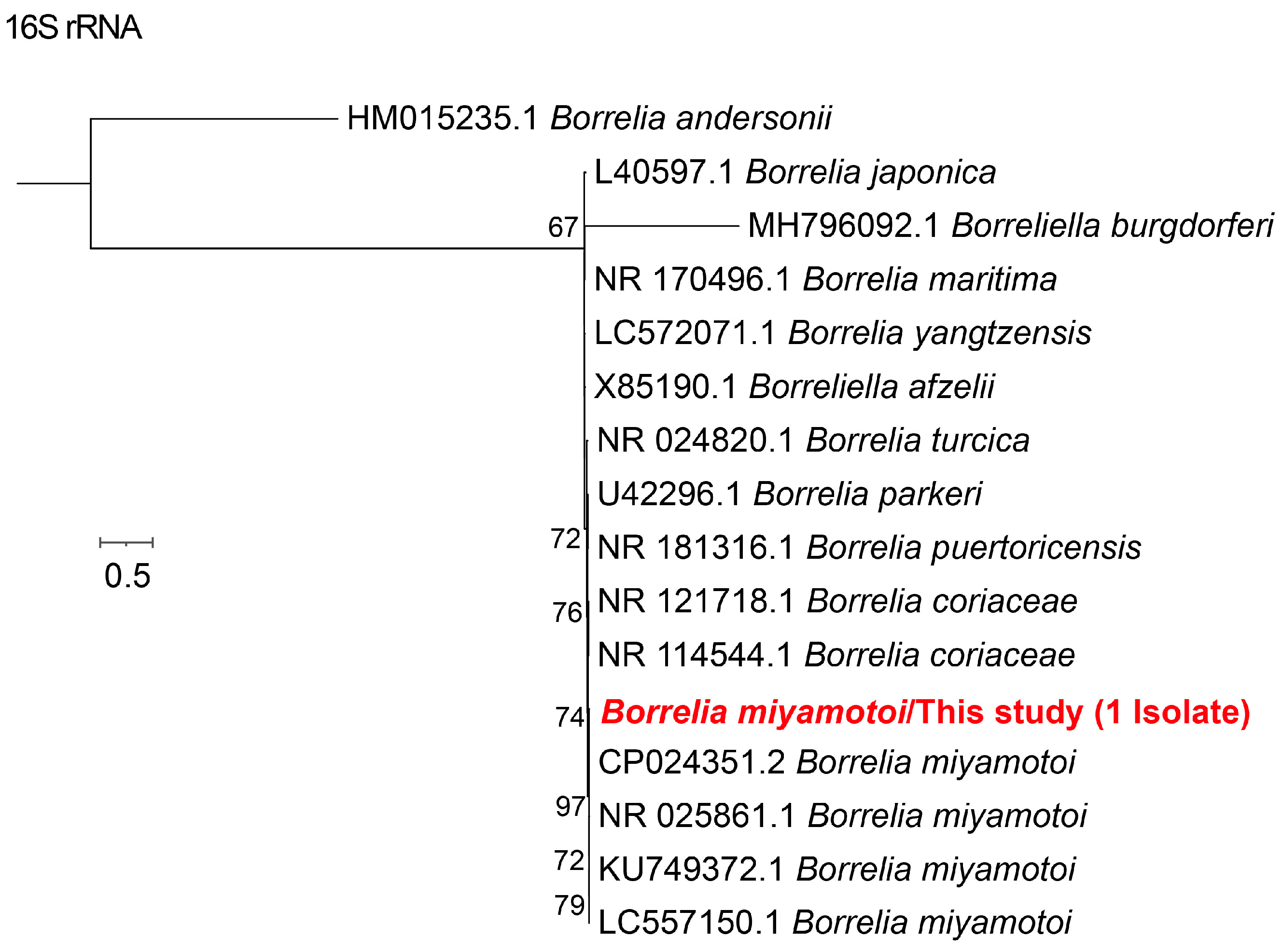 | Ca. R. tarasevichiae + B. miyamotoi | 1 (0.49, 0.09~2.72) | 0 (0) | 0 (0) | 0 (0) | 1 (0.43, 0.08~2.4) |