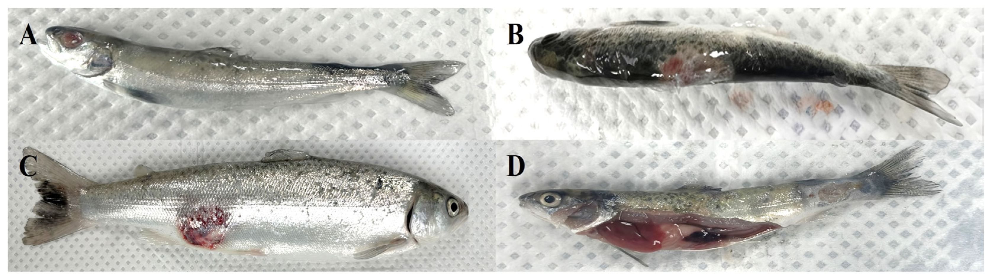 - Kim, D.H.; Byun, H.J.; Lee, S.H.; Woo, S.J.; Park, J.J.; Joo, M.S. Characterization of Aeromonas salmonicida subsp. masoucida and subsp. salmonicida isolated from Atlantic salmon (Salmo salar). J. Fish. Marine. Sci. Educ. 2024, 36, 1191–1204. (In Korean) [Google Scholar] [CrossRef]