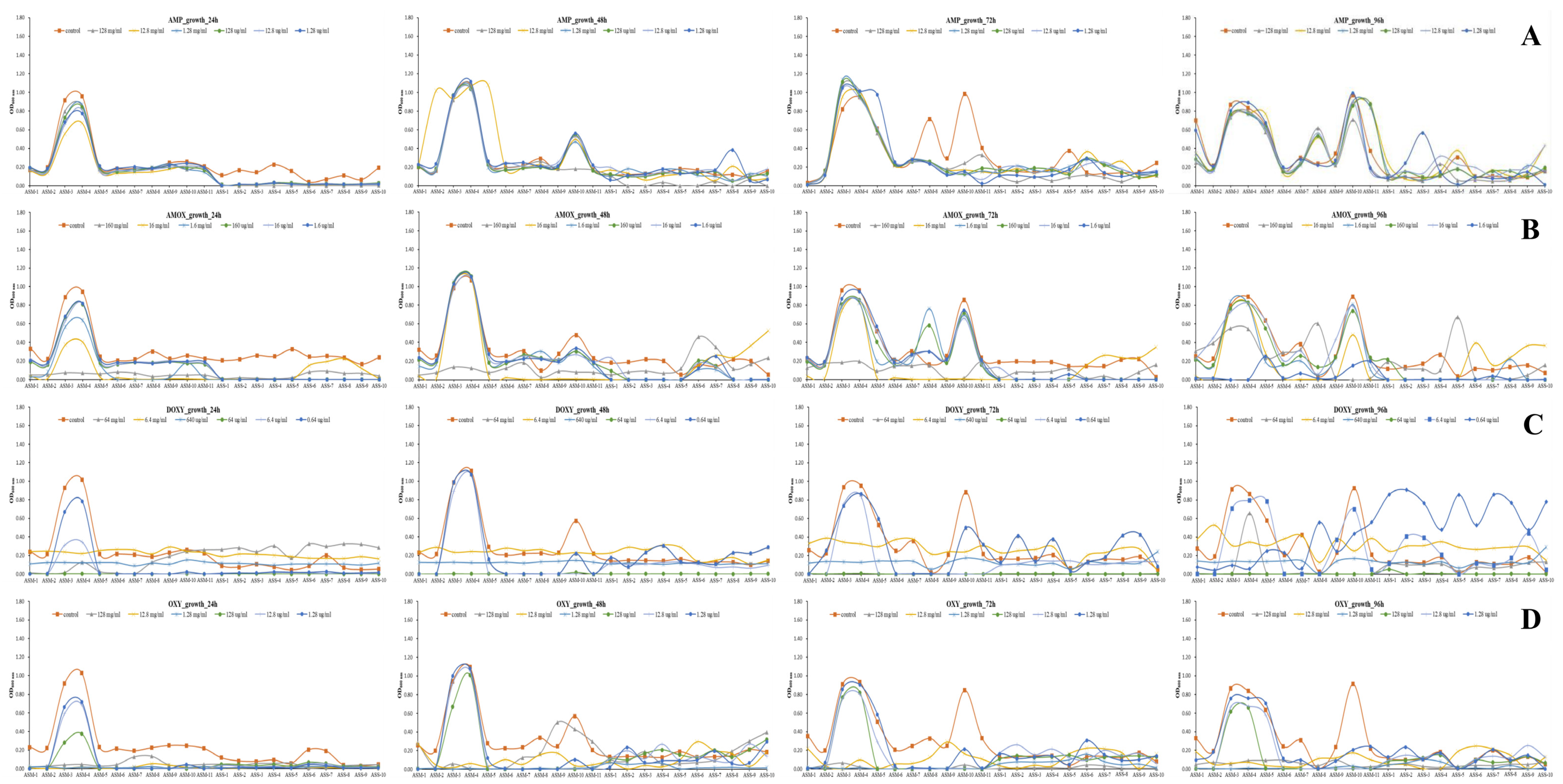 2.4. Assessment of Growth and Biofilm Formation in Response to Antibiotic Concentrations