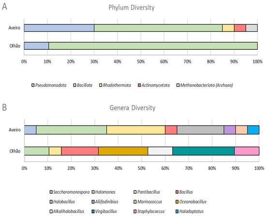 Microbial diversity at phylum (A) and genus (B) levels obtained from salt and sediment samples from two Portuguese salterns, Aveiro and Olhão.