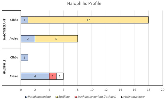 Overall, the halophilic profile of the isolates discussed above, taking into account their phyla taxonomic rank, is summarized in Figure 4.