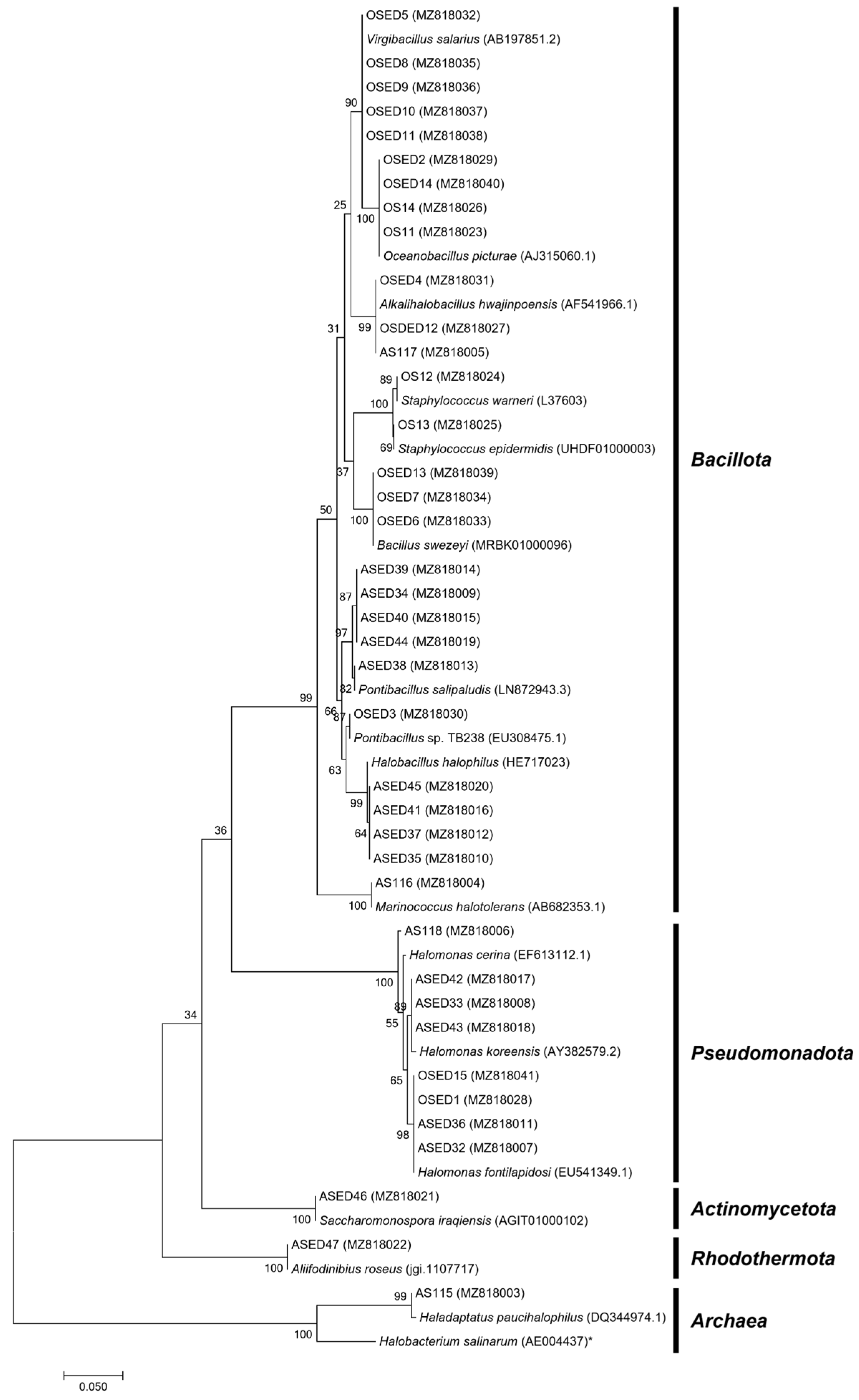 - Hua, N.-P.; Hamza-Chaffai, A.; Vreeland, R.H.; Isoda, H.; Naganuma, T. Virgibacillus salarius sp. nov., a halophilic bacterium isolated from a Saharan salt lake. Int. J. Syst. Evol. Microbiol. 2008, 58, 2409–2414. [Google Scholar] [CrossRef]
