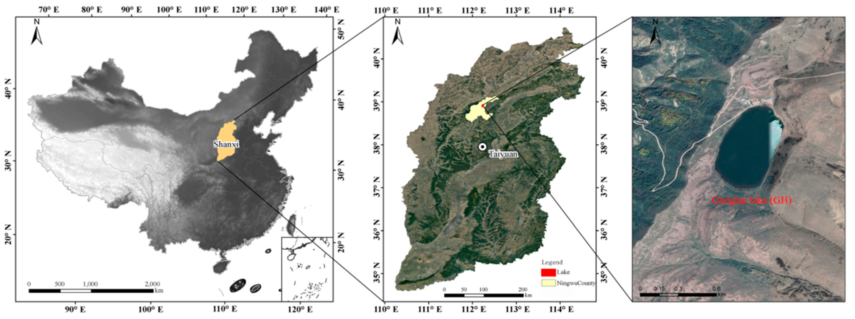 - Wang, X.; Wang, Z.; Chen, J.; Liu, J.; Wang, H.; Zhang, S.; Xu, Q.H.; Chen, F.H. Origin of the upland lake group in Ningwu Tianchi Region, Shanxi Province. J. Lanzhou Univ. (Nat. Sci.) 2014, 50, 208–212. [Google Scholar] [CrossRef]
