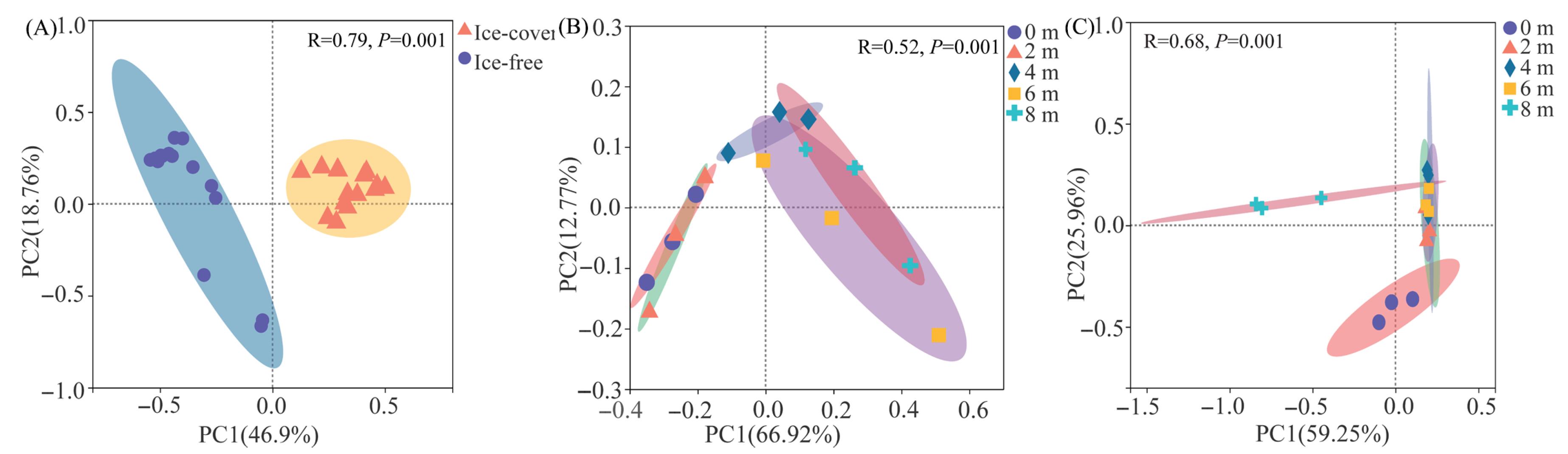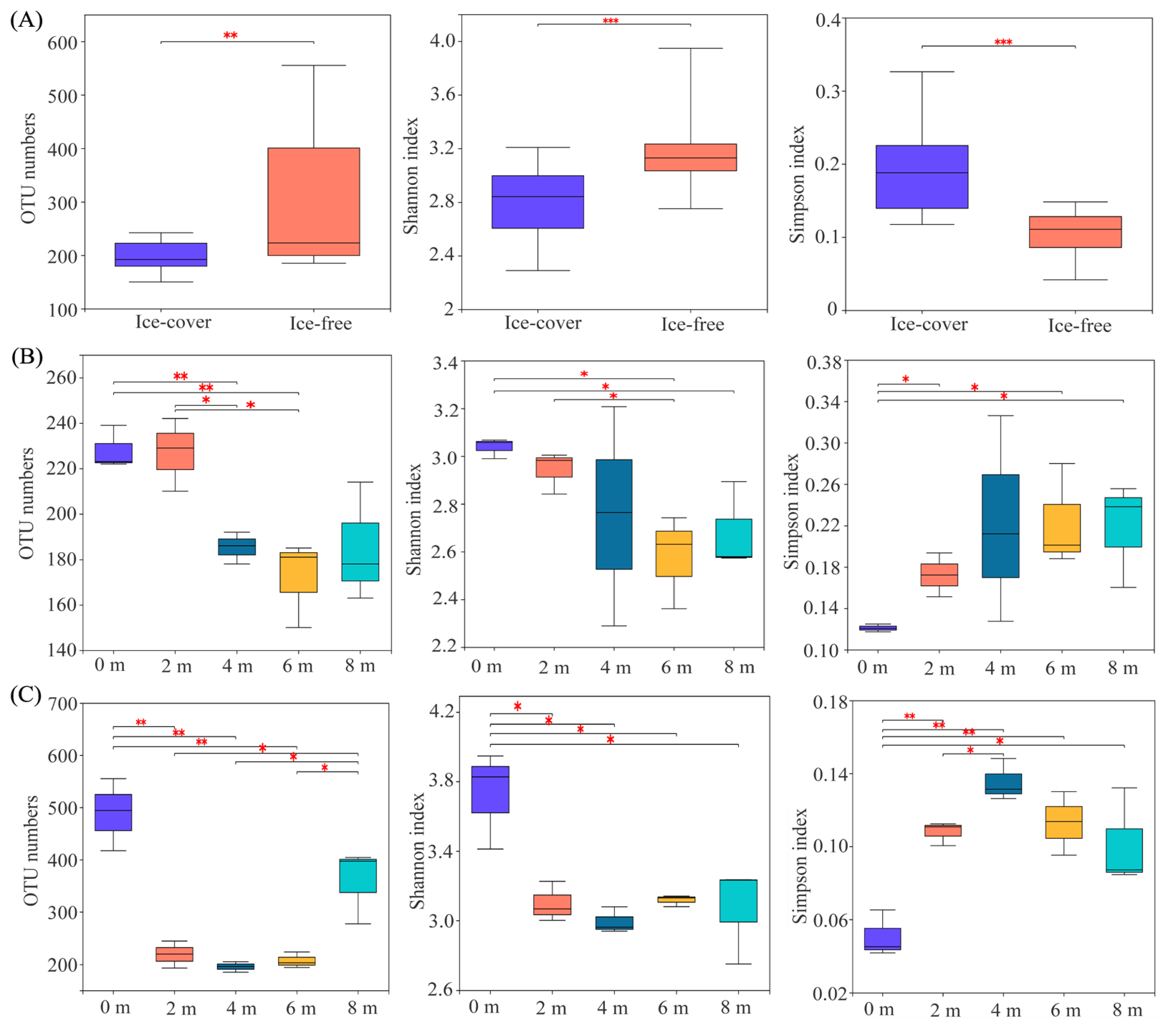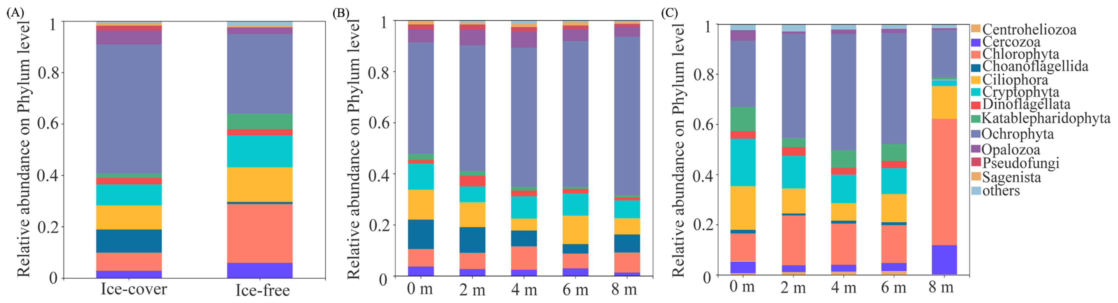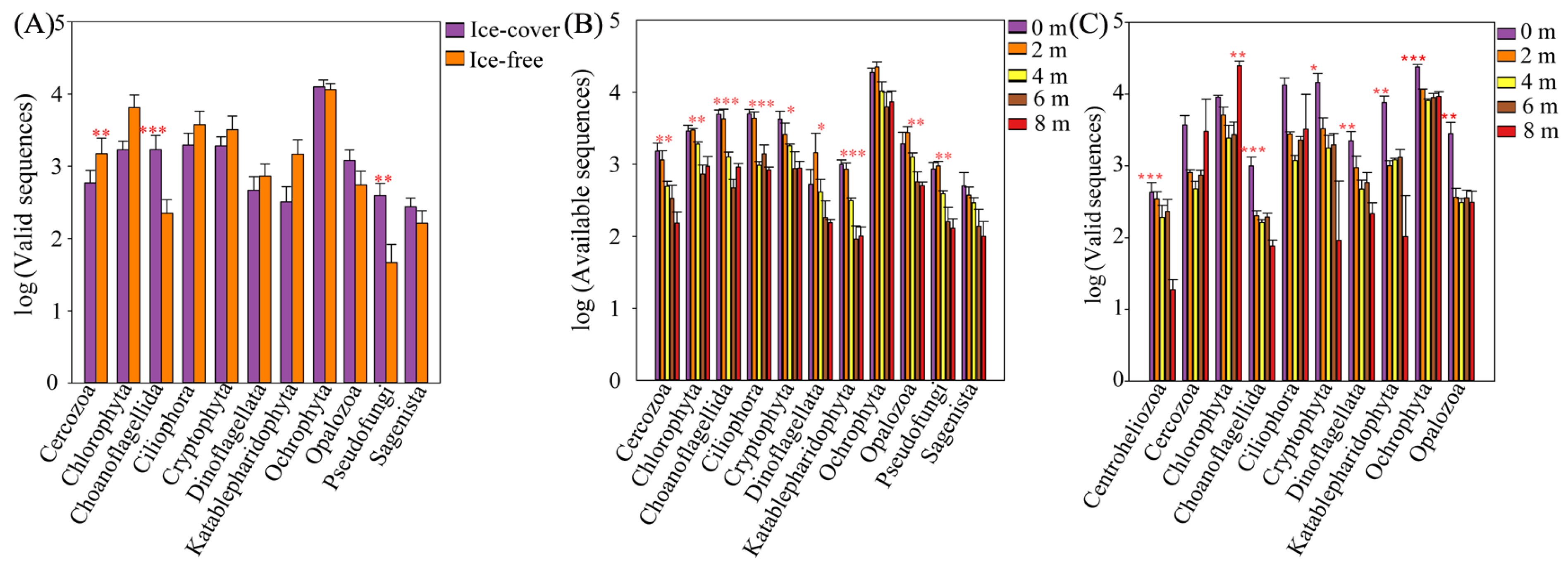 3.2. Changes in Protistan Community Composition Across Seasonal Freeze–Thaw Cycles and Lake Depths
