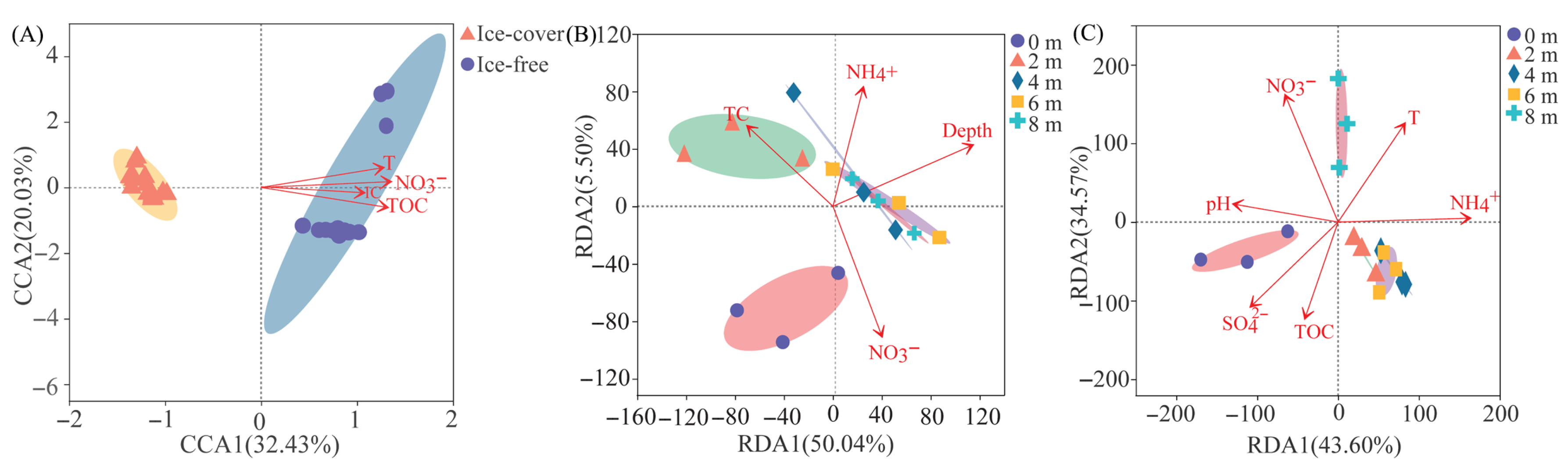 | Factors | CCA1 | CCA2 | R2 | p | Factors | RDA1 | RDA2 | R2 | p | Factors | RDA1 | RDA2 | R2 | p |