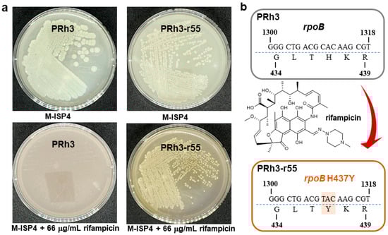 7 spores) of PRh3 were spread onto an M-ISP4 plate containing different concentrations (5–100 μg/mL) of rifampicin and cultivated at 28 °C for persistent observation. Then the minimal inhibition concentration (MIC) of rifampicin against PRh3 was determined at 22 μg/mL. The following treatments of PRh3 were carried out by applying rifampicin at concentrations of 1 × MIC-5 × MIC on the M-ISP4 plates to obtain resistant mutant strains. Genetic characterization of the