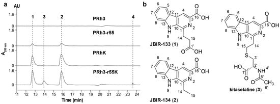 ksl in PRh3-r55 and generated the derivative mutant strain PRh3-r55K. This attempt not only effectively enhanced the production of JBIR-133 and JBIR-134, but also achieved a synergistic effect between the heterologous expression of