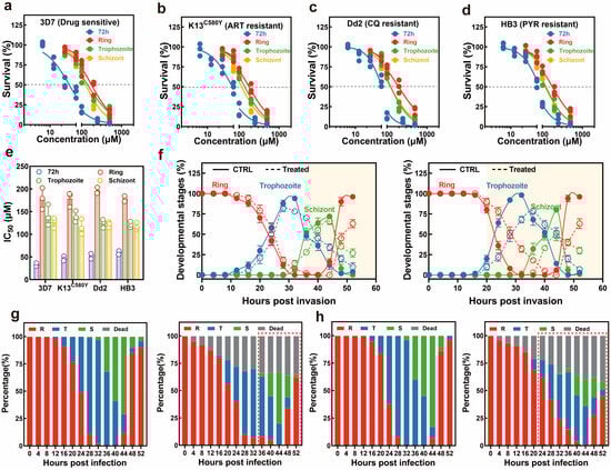 29]. Thus, additional quantitative assessments of stage-specific drug sensitivity have been performed to investigate the mode of action (MOA) of novkitasetaline. Notably, in contrast to the 72 h growth inhibition assay, a similar growth profile as well as IC