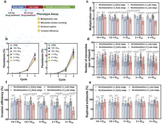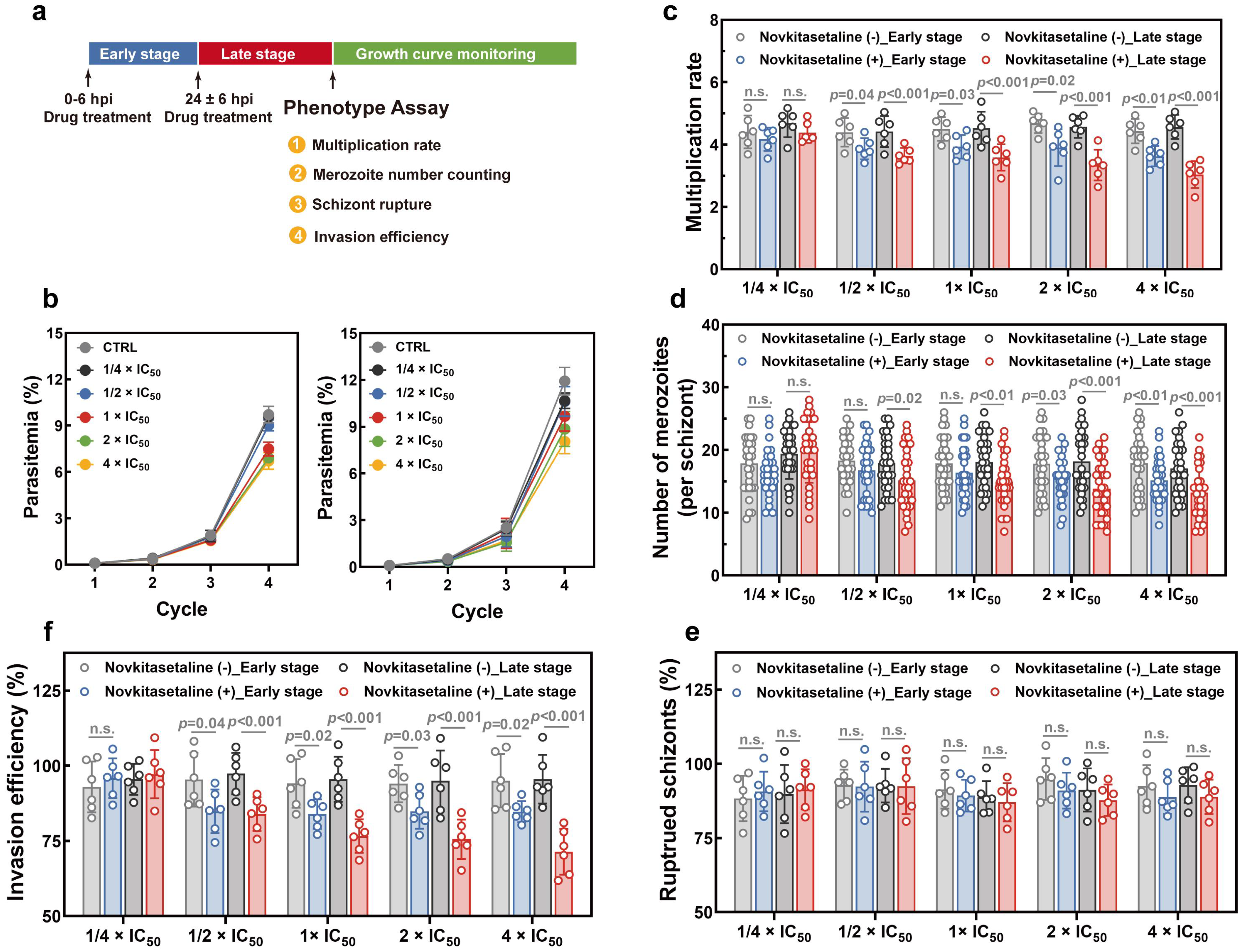 P. falciparum strains. Late-stage parasites exhibit significantly higher sensitivity than early-stage parasites. Given that late-stage parasite proliferation is associated with the progression of the parasite’s IDC, this finding strongly indicates that exposing late-stage parasites to novkitasetaline can markedly impair parasite normal developmental processes. Detailed growth phenotype assays have confirmed that exposure to novkitasetaline at the late developmental stage significantly halts the parasite’s progression, in which both a notable reduction in the number of newly invaded ring-stage parasites and an increase in the accumulation of arrested schizont-stage parasites have been observed. Meanwhile, the reduced number of merozoites per schizont further indicated that exposure at the late stage can remarkably disrupt parasite development. Furthermore, invasion/egress assays provided additional support for this conclusion, confirming that novkitasetaline exposure impairs parasite development rather than interfering with schizont rupture. Collectively, our results demonstrated that novkitasetaline exerts its antimalarial activity by targeting