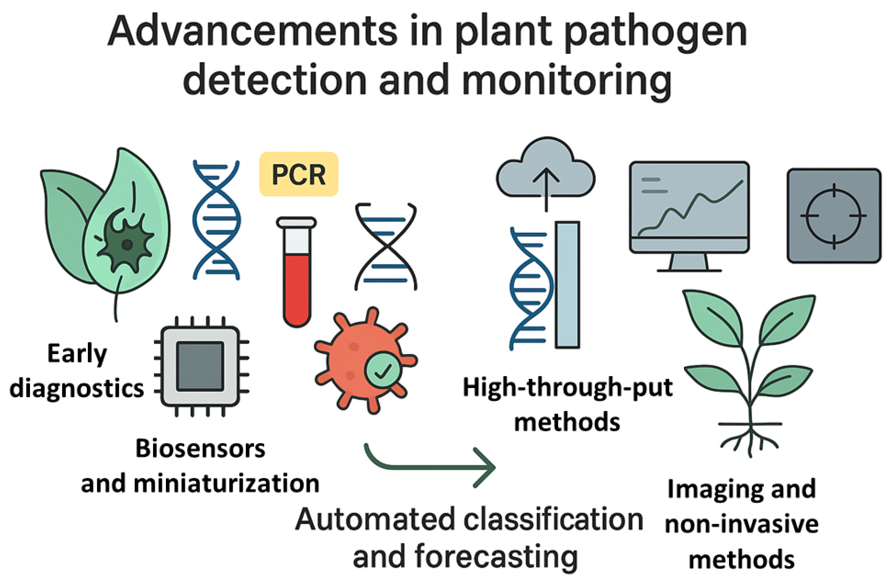- Patela, R.; Mitrab, B.; Vinchurkarc, M.; Adamib, A.; Patkarc, R.; Giacomozzib, F.; Lorenzellib, L.; Baghin, M. A review of recent advances in plant-pathogen detection systems. Heliyon 2022, 8, e11855. [Google Scholar] [CrossRef] [PubMed]