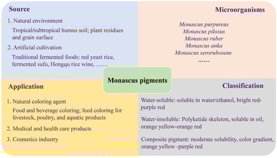 MPs are produced by Monascus through solid-state or liquid fermentation and belong to natural edible pigments [7]. The strains that have been reported capable of producing MPs include Monascus purpureus, M. ruber, M. anka, and M. pilosus (Figure 1). Monascus strains produce a variety of pigment compounds that can be classified into yellow, orange and red types based on their color characteristics [8,9]. These pigments have aroused people’s research interest due to their diverse chemical structures and properties [10].