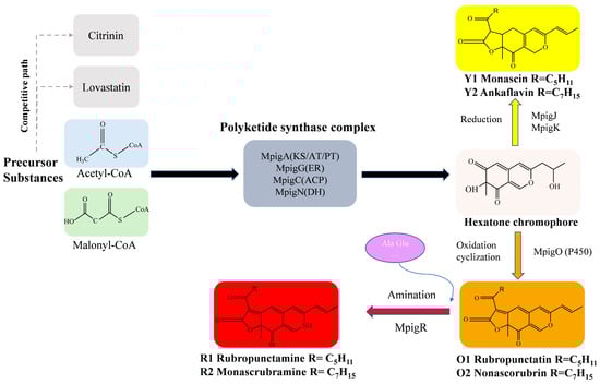 The biosynthesis of MPs follows the polyketide pathway, using acetyl-CoA and malonyl-CoA as precursors (Figure 2), which has been extensively studied in recent years [8]. Key enzymes and regulatory mechanisms in this pathway have been progressively elucidated, revealing strain-specific differences in gene expression and metabolic regulation that account for variations in pigment yield and composition among different Monascus strains [19,20].