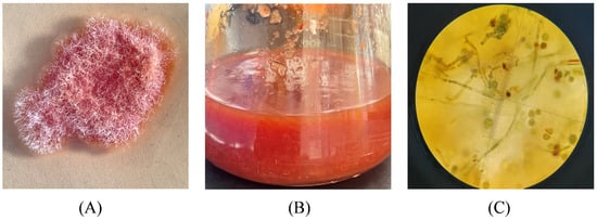 Under aseptic conditions, red yeast rice was ground into powder and homogenized with 90 mL of sterile 0.9% (v/v) NaCl solution [31]. The mixture was then cultured at 30 °C, 150 rpm for 5 h. After enrichment, the suspension was diluted and spread onto PDA solid medium, which was subsequently incubated at 30 °C for 48 h. Orange/orange-red single colonies with distinct morphological characteristics were picked and subjected to streak purification. Following three repetitions of the aforementioned steps, vigorously growing single colonies were selected. By repeating these procedures more than three times, single colonies with different morphologies can be selected, numbered, and stored at 4 °C for future use. Strain activation was achieved by inoculating these isolated single colonies into PDB liquid medium and incubating for 48 h at 30 °C with shaking at 150 rpm. Based on characteristics such as the depth of the bacterial suspension color and pigment diffusion range, strains with vivid colors and large diffusion ranges were selected for identification.