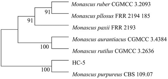 The ITS sequencing results of strain HC-5 were compared with other species, and a phylogenetic tree was built. The finding demonstrated that strain HC-5 shared the closest phylogenetic relationship with Monascus purpureus CBS109.07 (Figure 4). Therefore, it was named as Monascus purpureus HC-5 (HC-5).