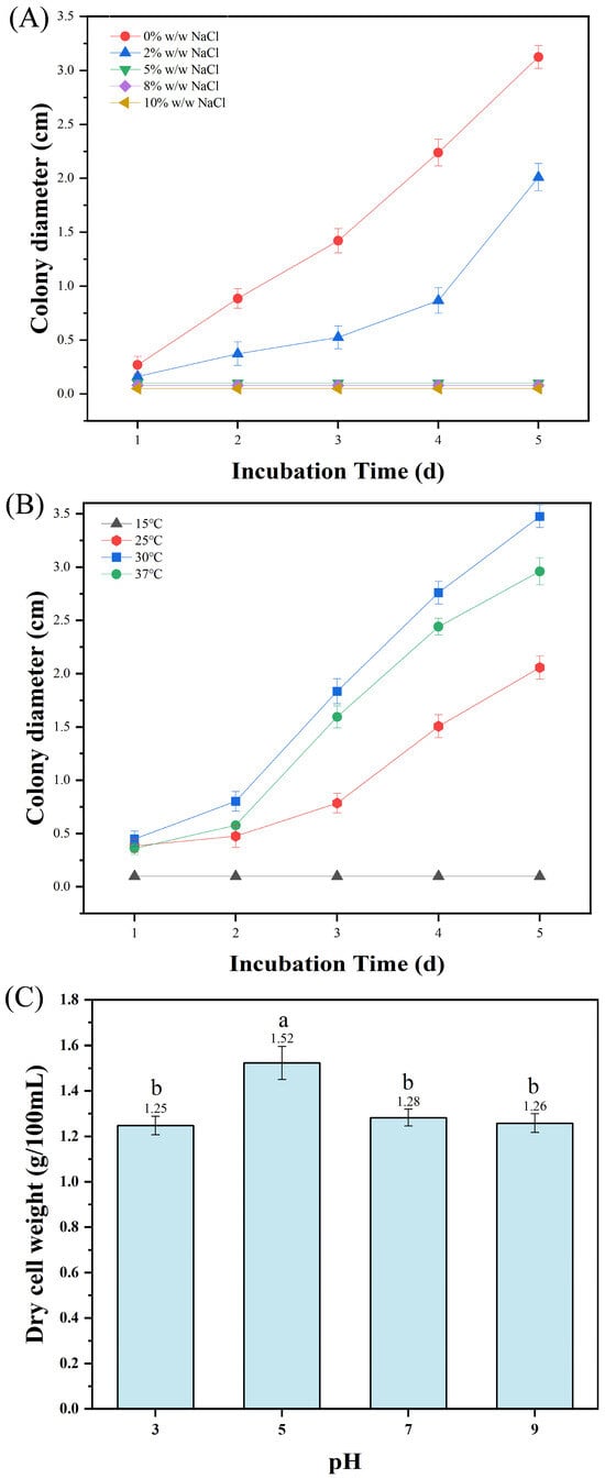 Colony morphology (color, texture, margin) of the target strain on PDA plates, mycelial morphology, and spore characteristics were examined under an optical microscope (Motic China Group Co., Ltd., Xiamen, China). Temperature gradients (15 °C, 25 °C, 30 °C, 37 °C), NaCl gradients (0%, 2%, 5%, 8%, 10% w/w), and pH gradients (3.0, 5.0, 7.0, 9.0) were established to determine single colony diameter/biomass dry weight of the strain under different conditions. Enzymatic activities were measured by spectrophotometry and expressed in U/mL. The activities of amylase and cellulase were determined by the DNS method, which is used to quantify the amount of reducing sugars released from starch and carboxymethyl cellulose, respectively [33,34]. Protease activity was measured using the Folin-phenol method with casein as the substrate.