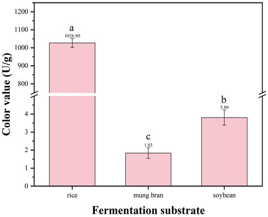 The type of fermentation substrate is the primary factor affecting the yield of secondary metabolites. In this study, when rice was used as the substrate, the MPs color value (1026.8 ± 107.8 U/g) was significantly higher than that of mung bean and soybean substrates (Figure 6). The advantage of rice may originate from its unique nutritional composition and physical structure. First, the main component of rice is starch, which provides an efficient and readily available carbon source for Monascus growth and metabolism. Second, the loose and porous structure of rice grains facilitates mycelial invasion and growth, providing a larger solid–liquid interface area, thereby promoting the transfer of oxygen and nutrients, which is crucial for aerobic Monascus fermentation [40]. In contrast, soybeans and mung beans with higher protein and fat content may not only have lower carbon source supply efficiency, but the ammonia or other intermediate products generated from their catabolism may also exert certain inhibitory or interfering effects on pigment synthesis [22].