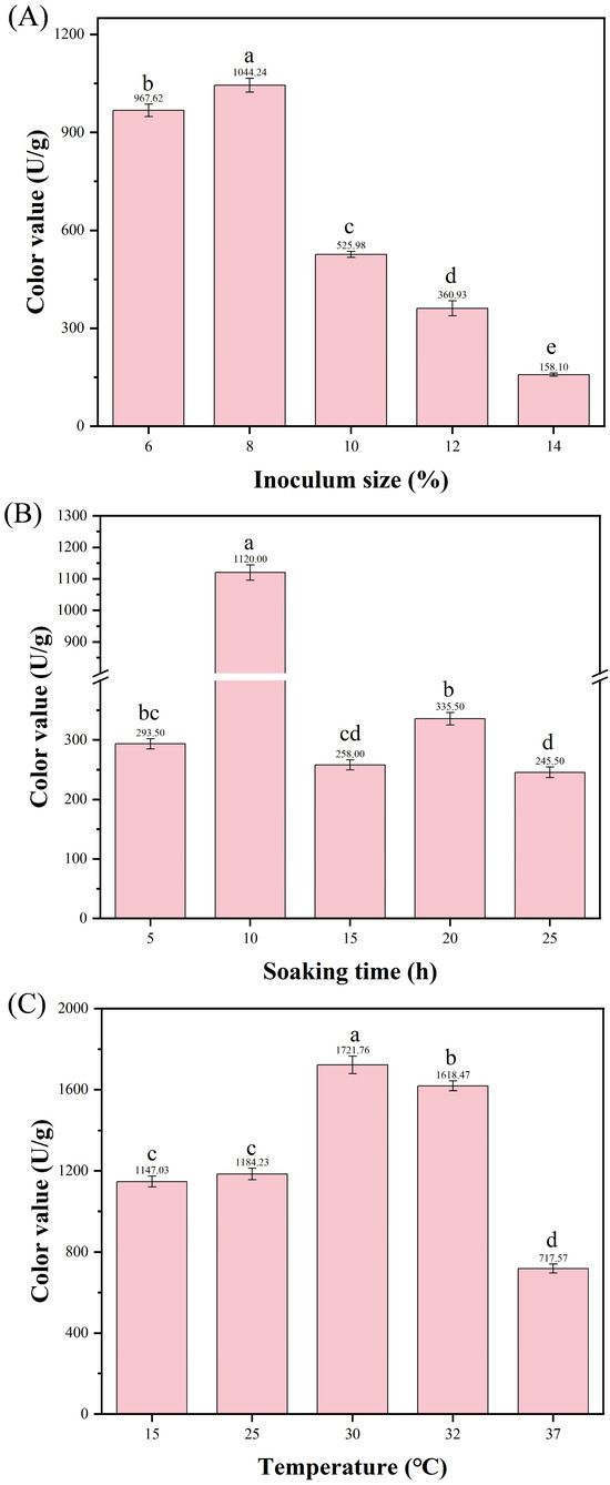 Effects of single factors on the color value of MPs. (A) Inoculum size (with fixed temperature of 30 °C and soaking time of 10 h); (B) Soaking time (with fixed inoculum size of 8% and temperature of 30 °C); (C) Temperature (with fixed inoculum size of 8% and soaking time of 10 h). Data are expressed as mean ± SD, and the different letters on the bar chart denote statistically significant differences among groups at p < 0.05 (one-way ANOVA).