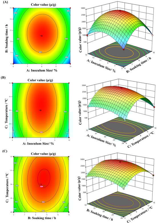 Integrating response surface analysis and regression equations, three-dimensional surface plots were created using Design-Expert 13.0 software to examine the effects of factor interactions on MPs color value (Figure 8). The results showed that the interaction between inoculum size and soaking time had an effect on MPs color value, but the effect was not significant (Figure 8A). The interactive effect between inoculum size versus temperature had a significant effect on MP color value (Figure 8B). Moreover, the interactive effect among soaking time and temperature had an extremely significant effect on MPs color value (Figure 8C). The statistical relevance of the pairwise interactions presented in Figure 8 aligns with the analysis outcomes of the p-values of the interaction items in Table 3. The optimal combination fermentation parameters for MPs yields simulated in this research were as listed below: inoculum size of 8.91%, soaking time of 13.59 h, and fermentation temperature of 32 °C. Under these fermentation conditions, the calculated maximum MPs color value was 2240.43 U/g.