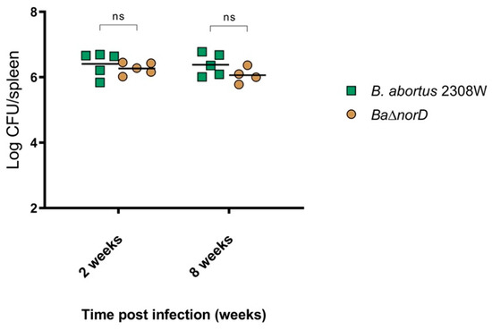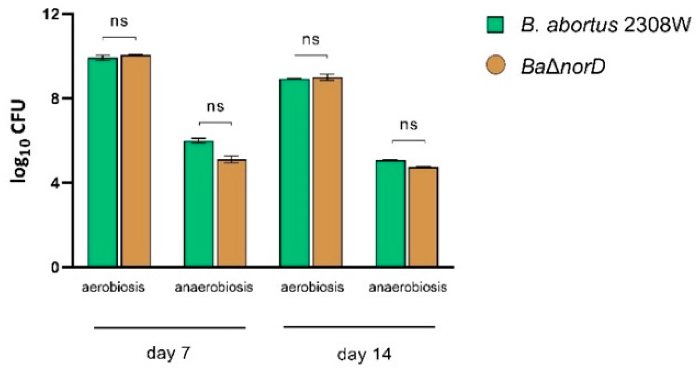 APA StyleRasheed, F., Zúñiga-Ripa, A., Salvador-Bescós, M., Irshad, H., Peña-Villafruela, R., Muñoz, P. M., de Miguel, M. J., Ali, Q., Conde-Álvarez, R., & Khan, S.-u.-H. (2025). Disruption of the Nitric Oxide Reductase Operon via norD Deletion Does Not Affect Brucella abortus 2308W Virulence. Microorganisms, 13(12), 2875. https://doi.org/10.3390/microorganisms13122875