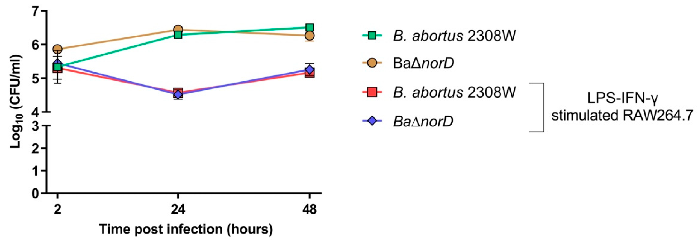 3.3. NorD Is Not Required for B. abortus 2308W Survival or Replication in Macrophages or in the Mouse Model