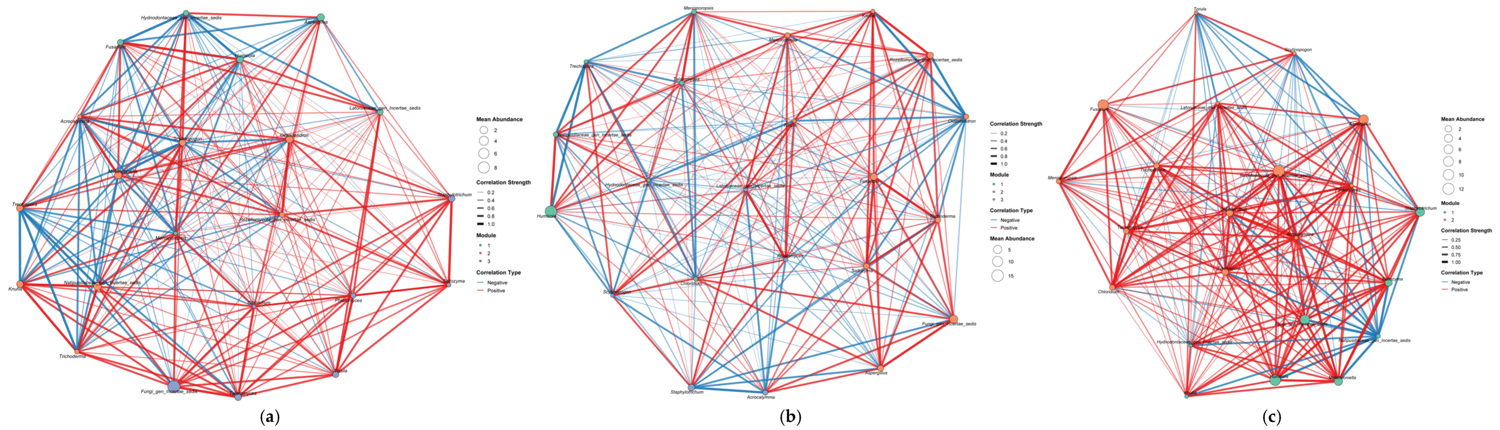 - Zhang, C.; Lei, S.; Wu, H.; Liao, L.; Wang, X.; Zhang, L.; Liu, G.; Wang, G.; Fang, L.; Song, Z. Simplified microbial network reduced microbial structure stability and soil functionality in alpine grassland along a natural aridity gradient. Soil Biol. Biochem. 2024, 191, 109366. [Google Scholar] [CrossRef]