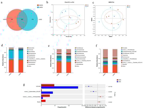 (a) LADG vs. HADG group OTUs Venn analysis; (b,c) LADG vs. HADG group principal co-ordinates analysis (PCoA) and Non-metric multidimensional scaling (NMDS) plots; (d–f) LADG vs. HADG group relative abundance at phylum, family, and genus levels; (g) LADG vs. HADG group plot of differential genera among microbes.